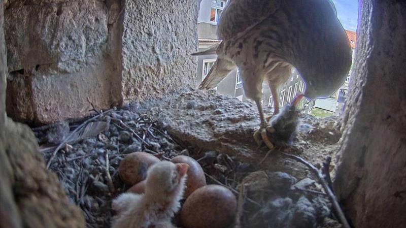 Ów swoisty Big Brother wśród piór trwa od kwietnia, gdy para pustułek zajęła i odnowiła gniazdo. Już w maju samica złożyła pięć jaj. Natomiast po kilku tygodniach ich wysiadywania, właśnie…