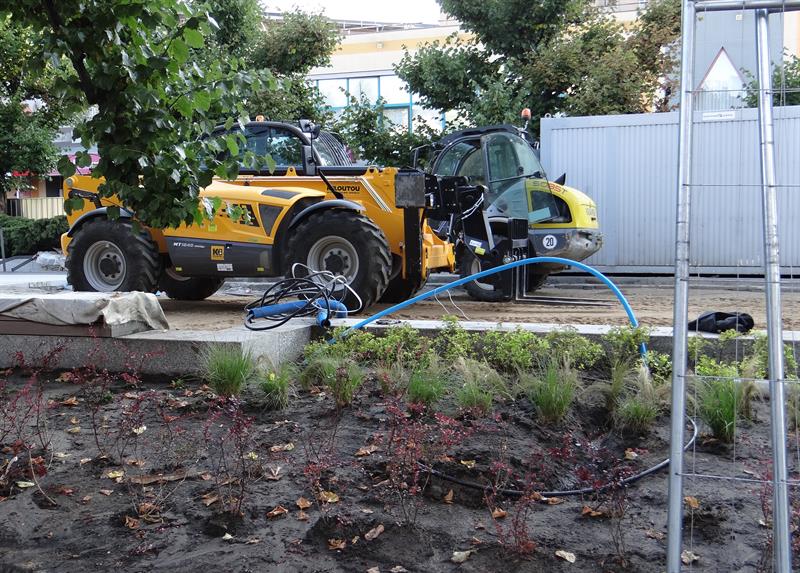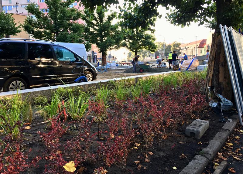 Widać postęp robót, ale też ich pośpiech. Na czym – niestety – cierpi zieleń. Zanim z placu wycofano ciężki sprzęt i podłączono media, na placu rozgrzebanej inwestycji posadzono krzewy, róże okrywowe, byliny i ozdobne trawy. To pomiędzy nimi – jałowcami, berberysami, tawułami, ostnicami i rozplenicami – teraz lądują materiały budowlane.