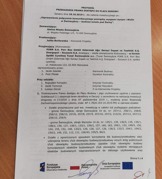 Umowę na zaprojektowanie i budowę tunelu podpisało miasto Świnoujście z konsorcjum, który wygrało przetarg we wrześniu 2018 roku. Wartość umowy z wykonawcą to 793 mln zł. Przez kolejne miesiące trwały prace projektowe, a podsumowaniem tego etapu prac było uzyskanie decyzji o zezwoleniu na realizację inwestycji drogowej, którą wojewoda zachodniopomorski wydał 7 października 2019 r. Następstwem tej decyzji jest m.in. przekazanie w piątek (18 października) placu budowy wykonawcy.