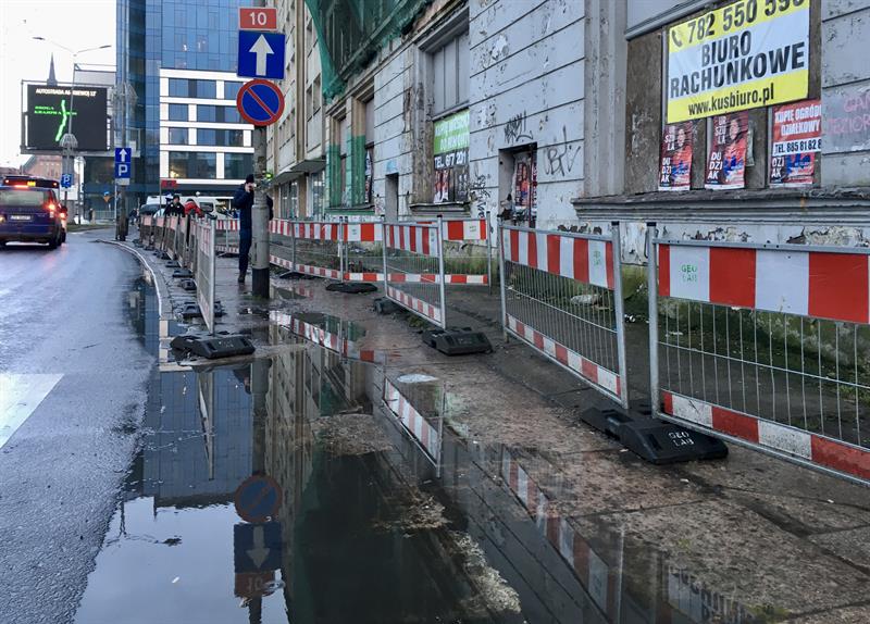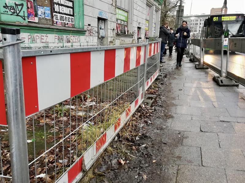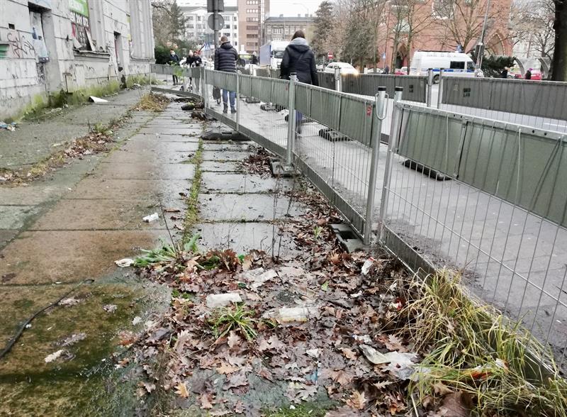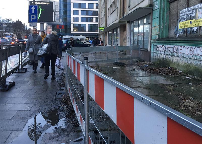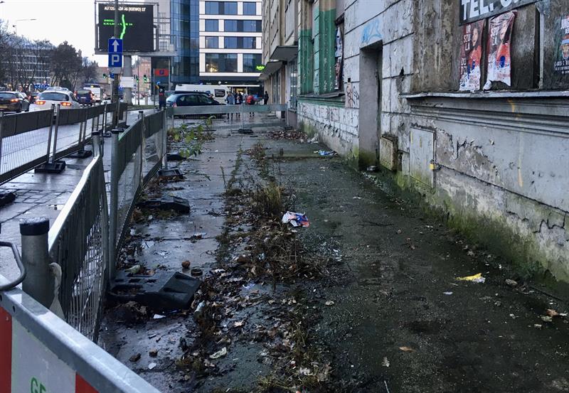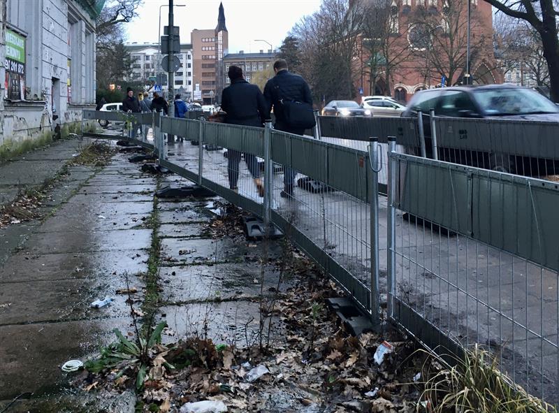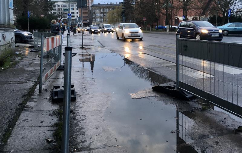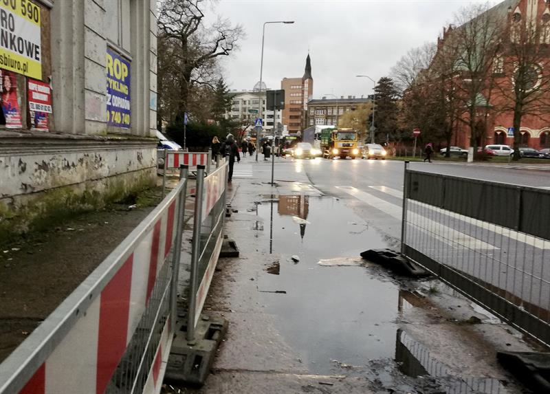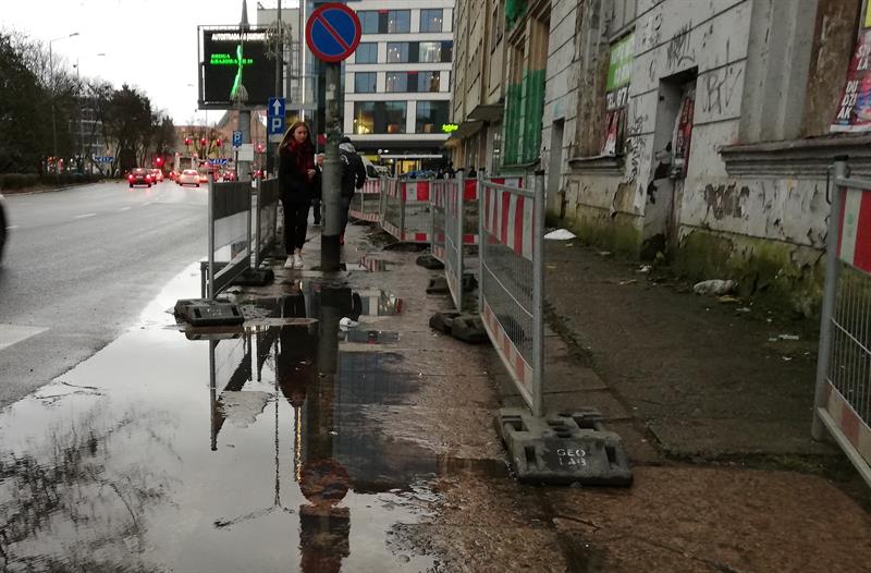 Podczas deszczowych dni rozlewiska, uniemożliwiające przejście wąskim przesmykiem między barierami, ustawionymi w tym miejscu przez ZDiTM ponoć dla bezpieczeństwa przechodniów, by nie spadł im gruz na głowy z elewacji zrujnowanego budynku dawnego hotelu Piast. Tonące w gromadzącej się deszczówce rejony obu pobliskich przejść dla pieszych. Bujne chwasty wyzierające spomiędzy wykoślawionych i zapadających się płyt granitowych, które już zaczął porastać nawet mech. Do tego zwały zleżałych liści zamieniających się w maź i walające się śmieci. Tak oto prezentuje się od miesięcy pas chodnika w centrum miasta na pl. Zwycięstwa. Ten stan rzeczy nie przeszkadza nikomu? ©℗