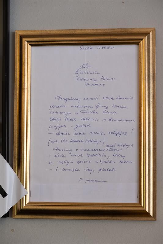 Właściciel restauracji połowicznie zakrył plakat taśmą z napisem "OCENZUROWANE". Jednocześnie podkreśla, że lokal jest miejscem dla wszystkich. "Wobec tego prosimy wszystkich o tolerancję. I rozsądek" - apeluje. W wydanym oświadczeniu załoga Public Fontanny podkreśla, że od początku istnienia restauracji starali się, aby lokal był również przestrzenią kulturalną, otwartą.