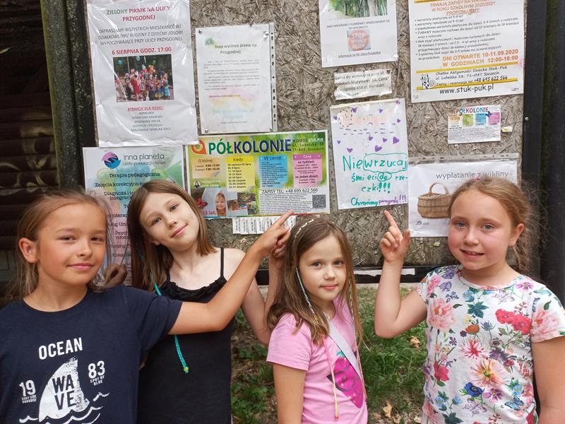 W końcu wpadły na pomysł specjalnej akcji dla ratowania Wierzbaka przed powodzią śmieci. Namalowały, a następnie rozwiesiły w rejonie „Przygodnej” dziewięć plakatów. Na nich – wśród kolorami malowanych serc, gwiazdek, rybek i innych cudaków – znalazły się następujące przesłania: „Uwaga! Mała rzeczka Wierzbak jest wciąż zaśmiecana. Możemy to zmienić! Nie wrzucając śmieci do rzeki! Chrońmy przyrodę! Chrońmy naturę!”.