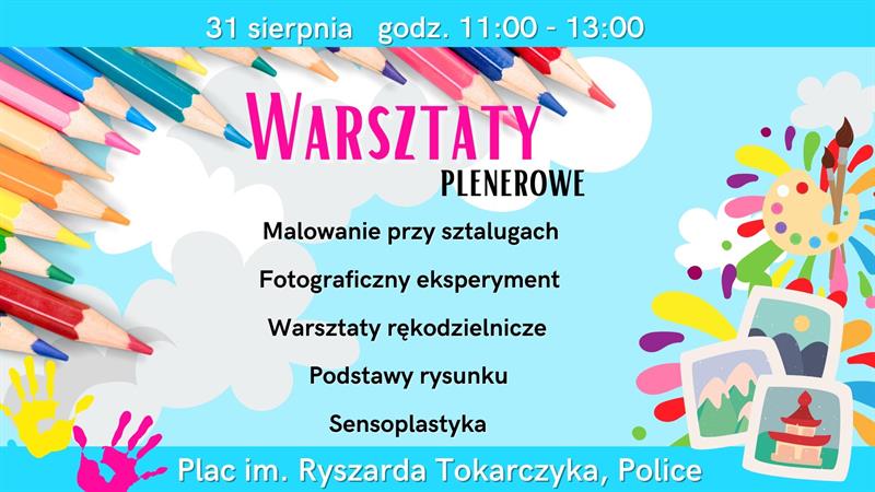 Miłośnicy sztuki – bardzo młodzi, młodzi i dojrzali – będą mogli wziąć udział w wyjątkowych plastycznych warsztatach plenerowych. Odbędą się w sobotę 31 sierpnia w Policach na placu im. Ryszarda Tokarczyka. To doskonała okazja, aby spróbować swoich sił w różnych formach sztuki. Zaprasza Miejski Ośrodek Kultury w Policach.