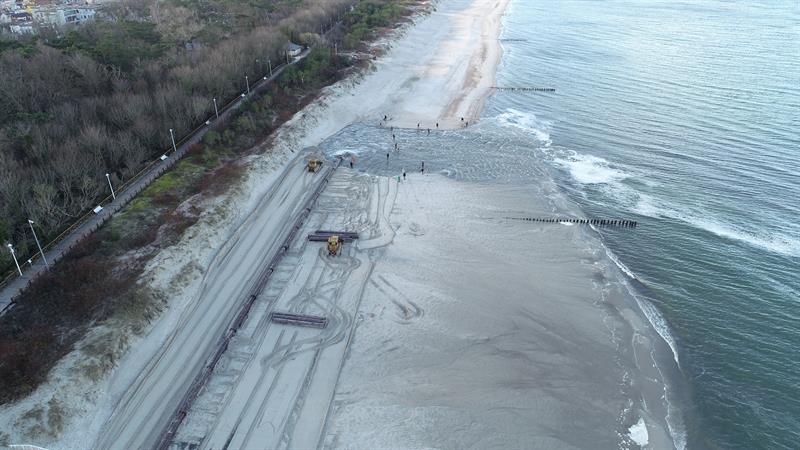 Do końca kwietnia, na niemal dwukilometrowym odcinku brzegu, w okolicy zejścia na plażę przy ul. Słonecznej w Dziwnowie, zostanie odłożone blisko 180 tys. m sześc. materiału piaszczystego.