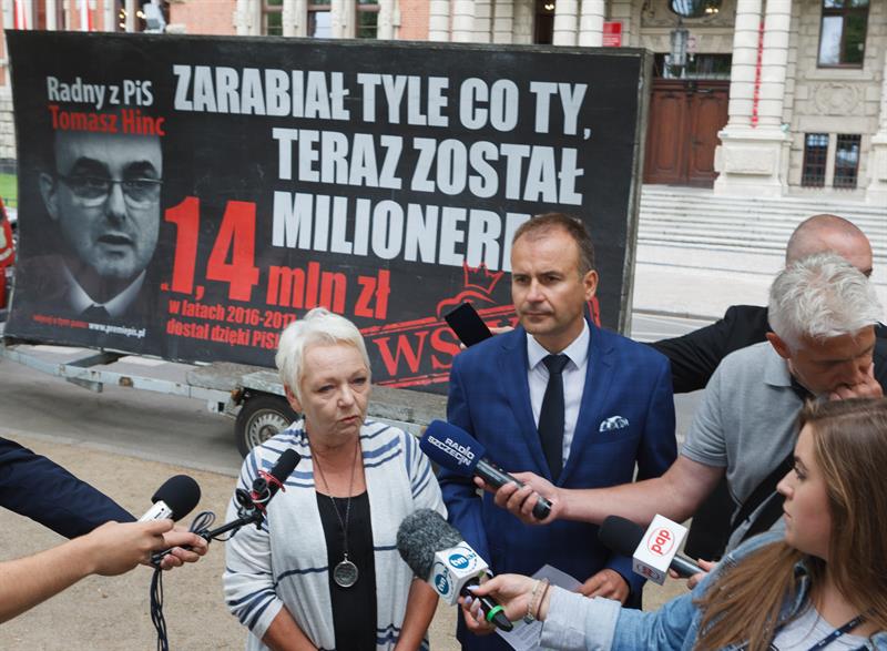 - Tym razem chcielibyśmy państwu pokazać tych moralizatorów, którzy chcą obniżać pensje samorządowcom a sami, pełniąc funkcję z ramienia PiS-u są milionerami, zarabiają dziesiątki, setki tysięcy złotych - stwierdził podczas briefingu Norbert Obrycki. - Często to osoby mierne, ale wierne linii PiS-u.