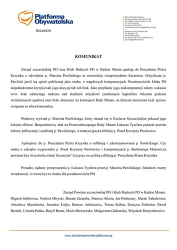 W sobotę wieczorem zarząd szczecińskiej PO wraz z klubem radnych Platformy w Radzie Miasta upublicznili apel do prezydenta Krzystka, w którym nawołują do odwołania Marcina Pawlickiego ze stanowiska wiceprezydenta Szczecina. Ich zdaniem „Pawlicki jawił się opinii publicznej jako osoba, o wątpliwych kompetencjach". Przykładani zaniechań wiceprezydenta ma być m.in. brak należytego nadzoru nad służbami miejskimi objawiające się np. zamknięciem kąpieliska Arkonka podczas wrześniowych upałów oraz brakiem obecności na komisjach Rady Miasta, na których omawiane były sprawy związane ze sferą komunalną.
