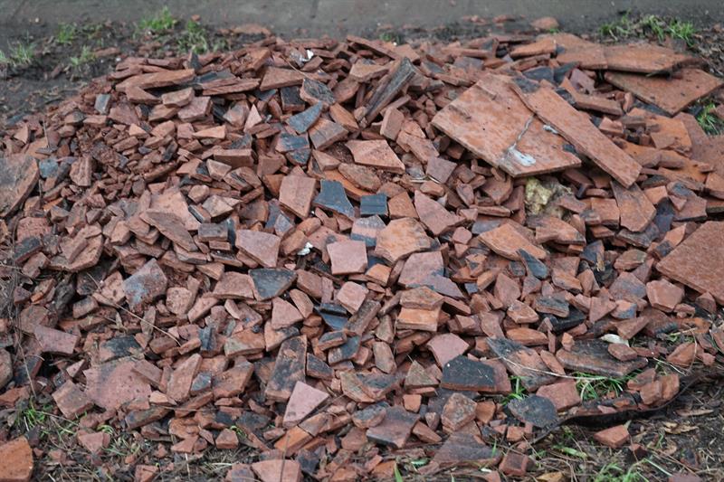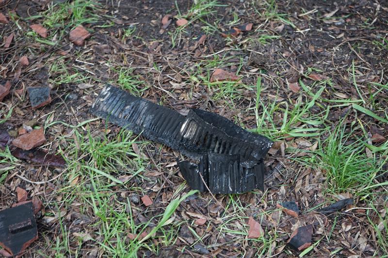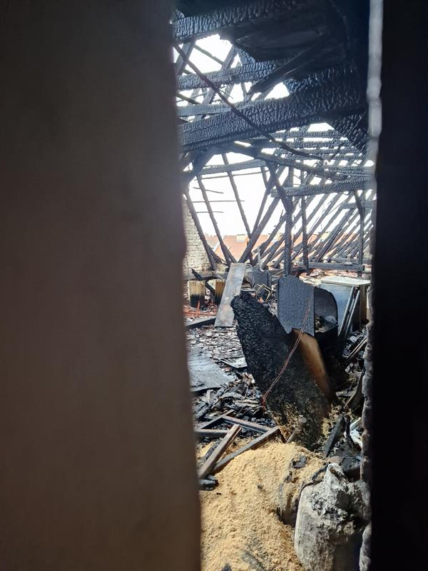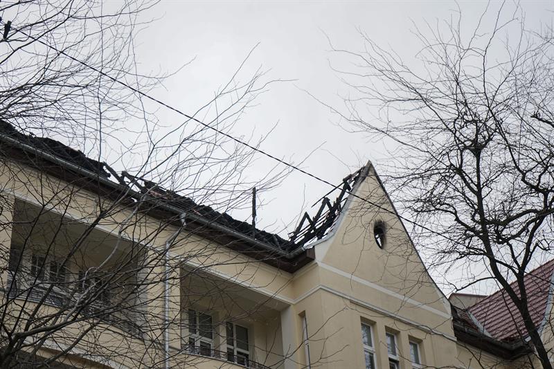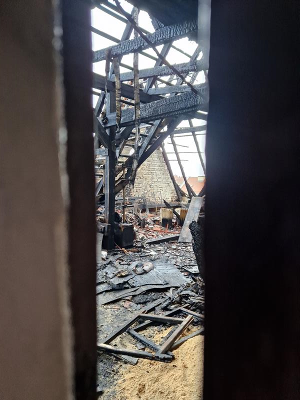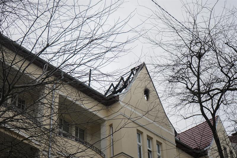 Pożar objął górną część budynku. Paliły sie drewniane stropy. Wokół budynku leżą zwęglone części dachu. Uszkodzeniu uległy również stojące pod budynkiem samochody.
