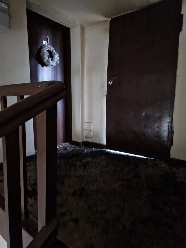 Na miejscu, przed budynkiem pojawiają się także jego poszkodowani lokatorzy. Przyjechali zabrać podstawowe rzeczy ze swoich zdewastowanych mieszkań. Bo choć ogień ogarnął jedynie górną część budynku, reszta mieszkań została zalana wodą z węży strażackich podczas akcji ratowniczej. Właścicielka jednego z mieszkań nie może mówić, płacze. Jest wstrząśnięta. Jej mąż pokazuje zalany pokój dziecka: na podłodze kałuża wody, przesiąknięty dywan, zalane sprzęty, meble.