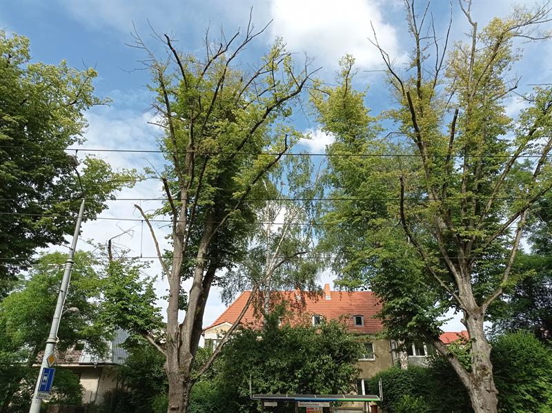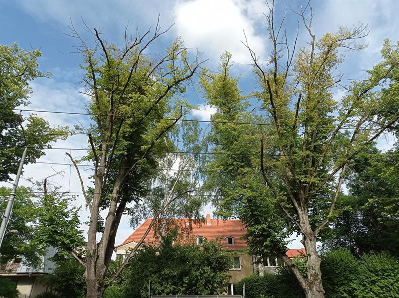 Dopiero teraz widać, jakie są konsekwencje radykalnej ingerencji w systemy korzeniowe drzew rosnących wzdłuż ul. Arkońskiej. Dokonane przy okazji przebudowy tejże ulicy. W wiekowych koronach widać coraz większy posusz. To oznaka postępującego zamierania, który potrwa lata aż do nieuchronnego finału.