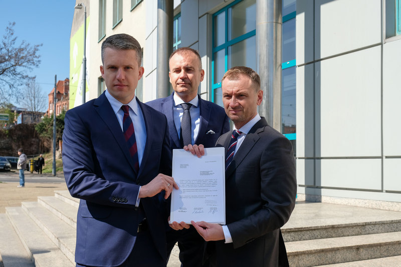 Od lewej: Posłowie Arkadiusz Marchewka, Norbert Obrycki i Sławomir Nitras przed siedzibą Stoczni Szczecińskiej z wnioskiem o udostępnienie dokumentów.