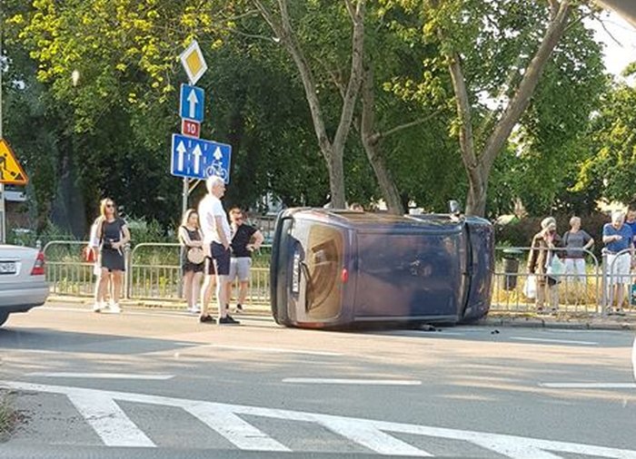 Dwa samochody marki toyota i renault zderzyły się w sobotę wieczorem w centrum Szczecina. W wyniku uderzenia jedno z aut przewróciło się na bok.