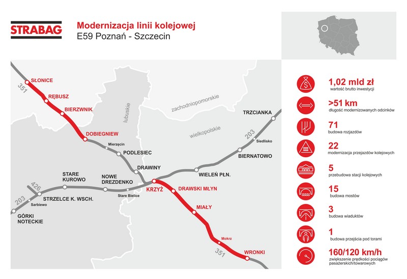 Całkowita modernizacja linii Szczecin – Poznań (wszystkich odcinków) oznacza 65 przebudowanych przez Strabag peronów na 32 stacjach i przystankach, 187 km zmodernizowanych torów i sieci trakcyjnej oraz 67 przebudowanych przejazdów kolejowo-drogowych.