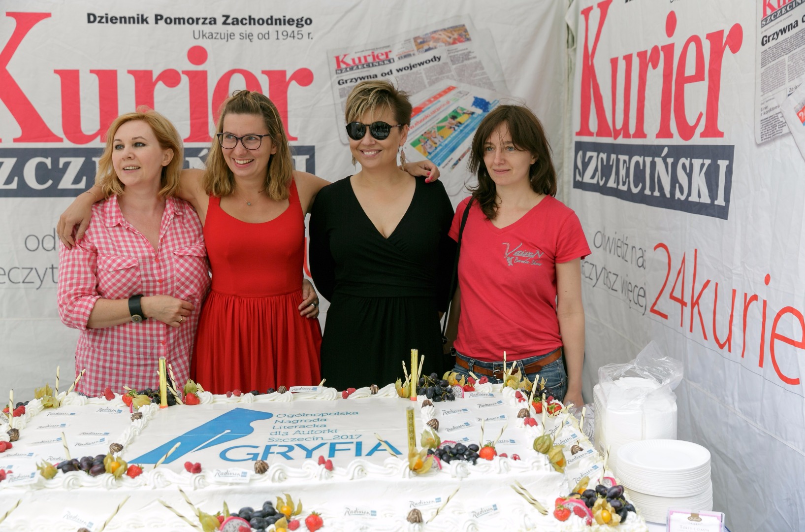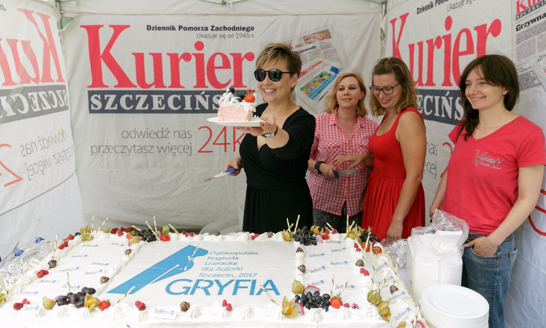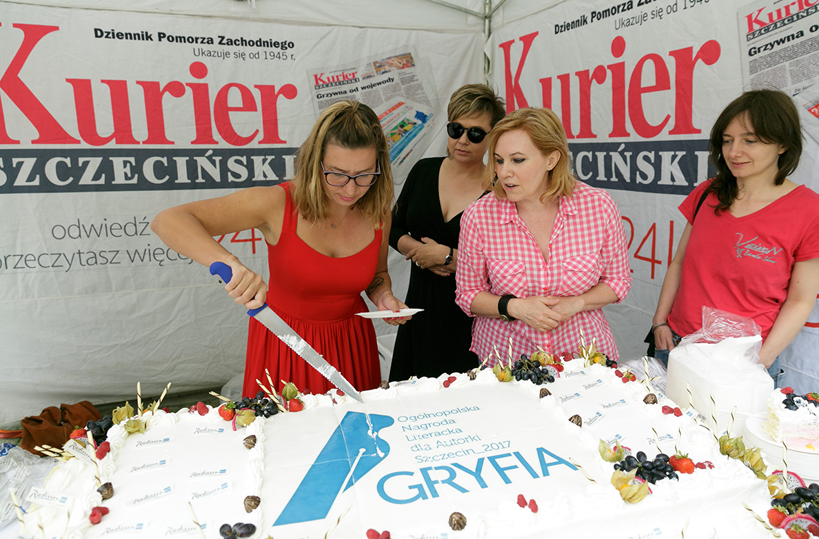 Katarzyna Boni, laureatka tegorocznej Gryfii, oraz finalistki Radka Franczak, Sylwia Kubryńska i Joanna Fabicka pomogły nam w pokrojeniu i rozdaniu specjału mieszkańcom Szczecina, którzy przyszli na imprezę „Odkryj książkę na nowo”. Chętnych - co widać na zdjęciach poniżej - nie brakowało.