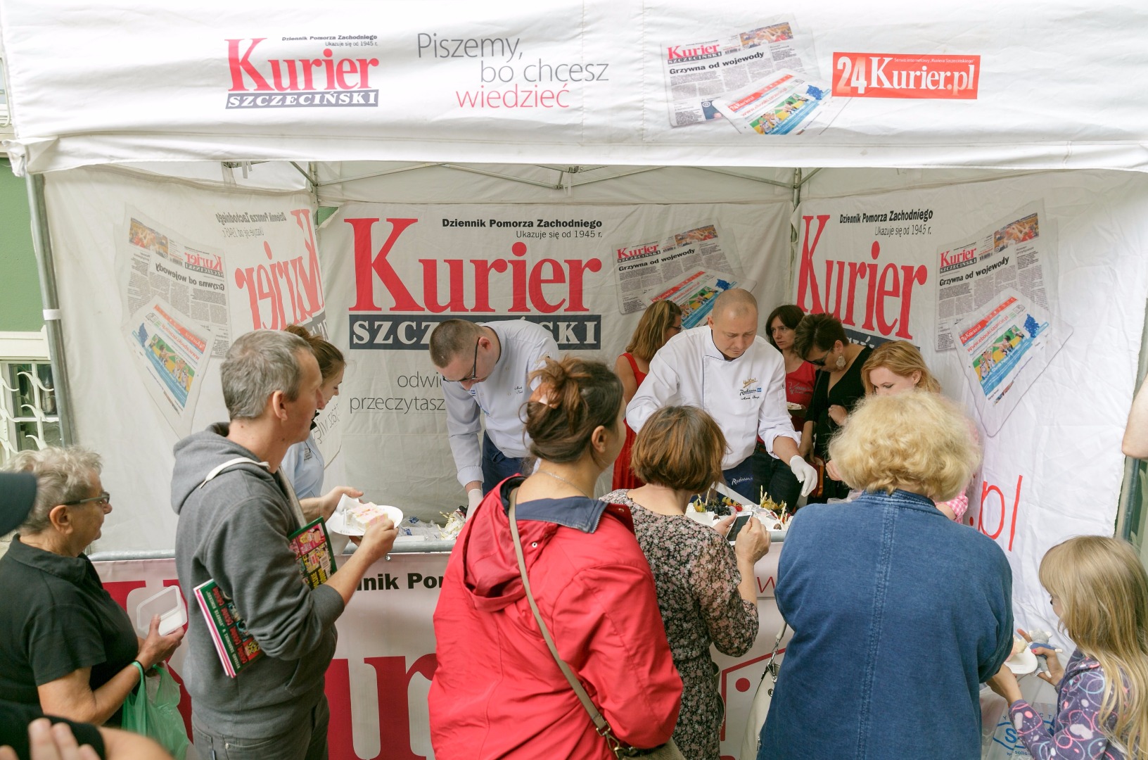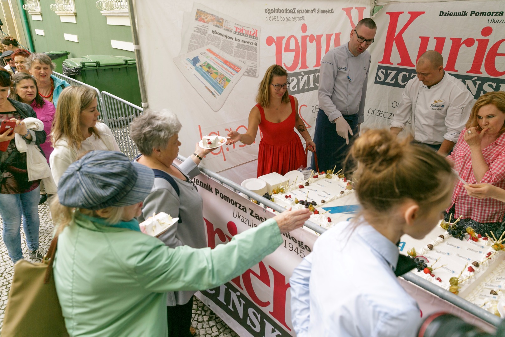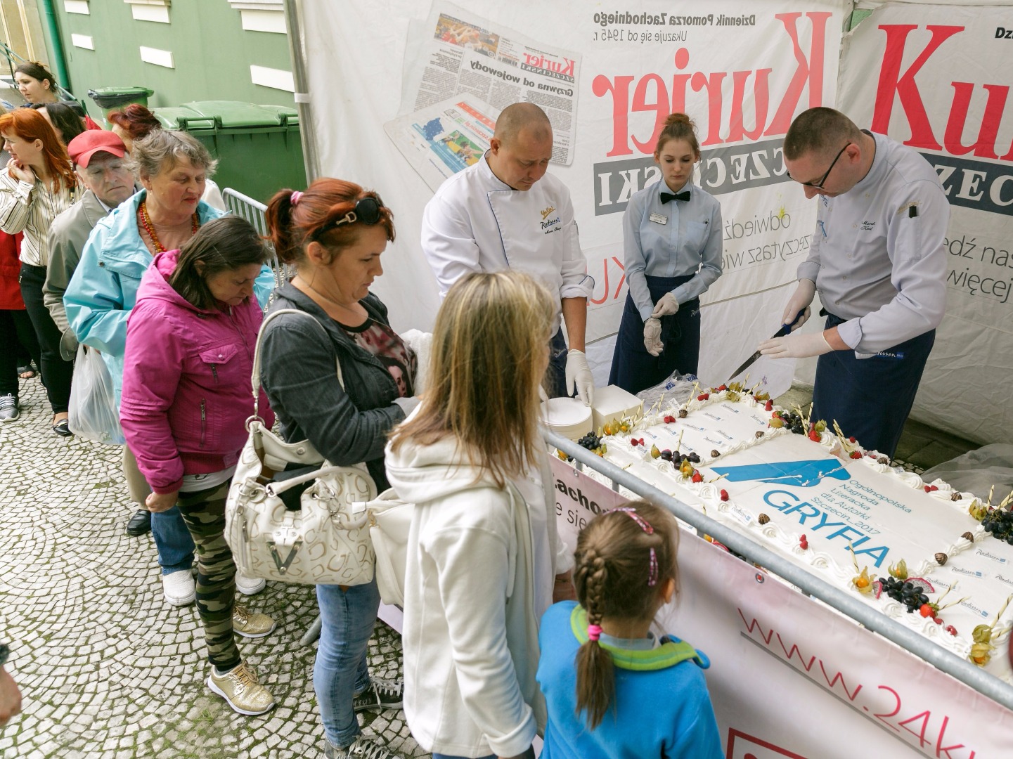 Katarzyna Boni, laureatka tegorocznej Gryfii, oraz finalistki Radka Franczak, Sylwia Kubryńska i Joanna Fabicka pomogły nam w pokrojeniu i rozdaniu specjału mieszkańcom Szczecina, którzy przyszli na imprezę „Odkryj książkę na nowo”. Chętnych - co widać na zdjęciach poniżej - nie brakowało.