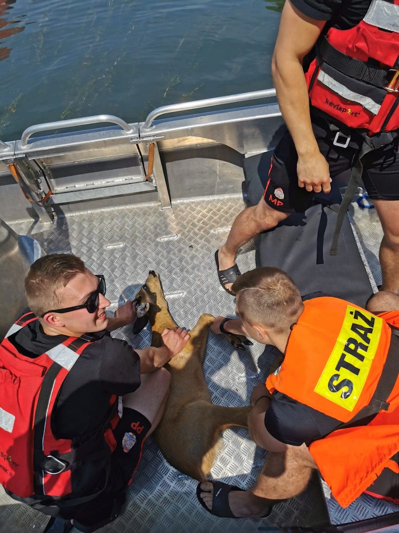 W trakcie ćwiczeń na jeziorze Miedwie strażacy z JRG Stargard zauważyli małego koziołka pływającego na środku akwenu. Młode zwierzę było już wyczerpane. Strażacy natychmiast podpłynęli do koziołka i wciągnęli go na pokład łodzi. Zwierzę zostało przetransportowane na brzeg.