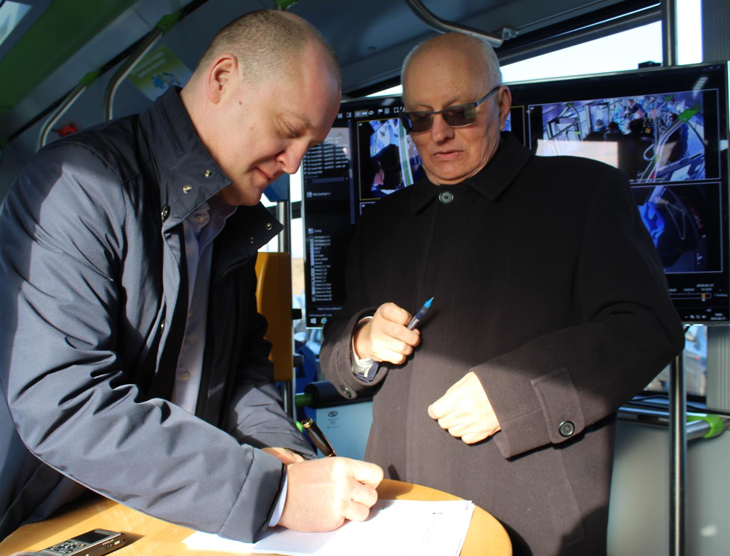 Na zdjęciu: Umowę na dostawę 16 autobusów hybrydowych podpisali Piotr Krzystek, prezydent Szczecina i Wiesław Cieśla, pełnomocnik prezesa zarządu Solaris Bus & Coach SA.