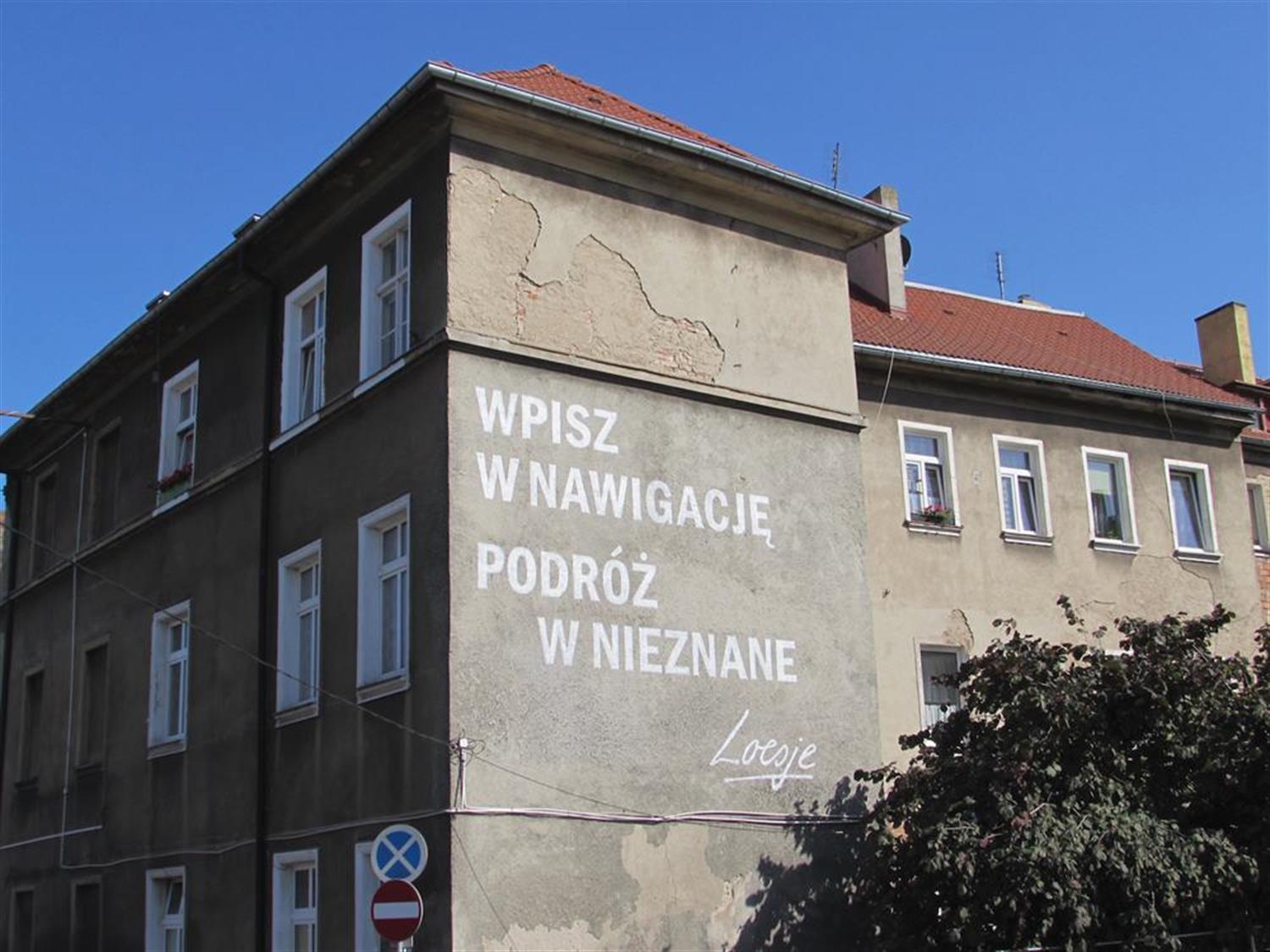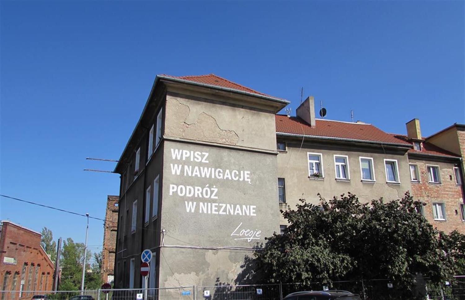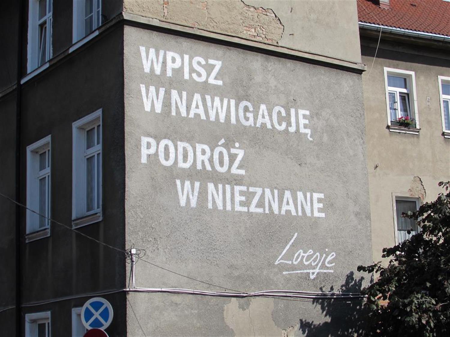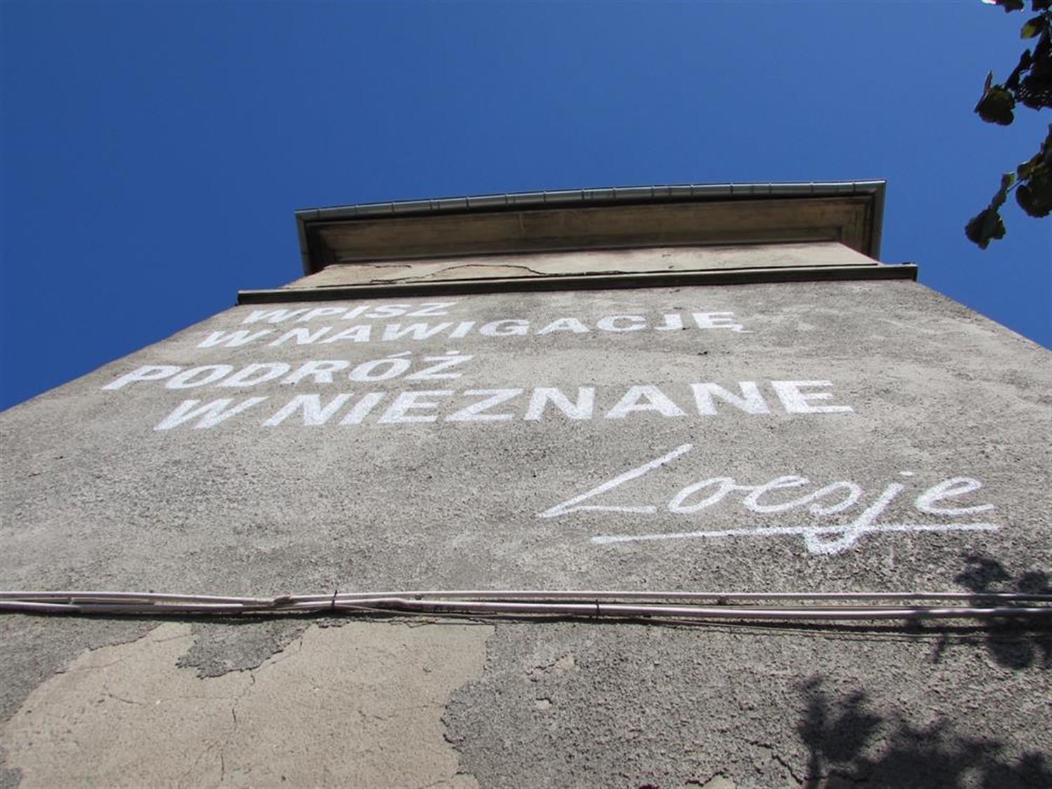 Na ścianie budynku przy ul. Krzysztofa Kolumba 3 w Szczecinie od niedawna widnieje minimalistyczny mural. Hasło „Wpisz w nawigację podróż w nieznane” namalowano białymi literami na naturalnym tle ściany. To charakterystyczna oszczędność formy murali Loesje, które kładą nacisk przede wszystkim na treść przekazu.