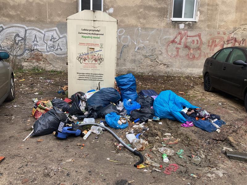 Wstyd dla miasta pojemniki na odzież , często stoją obłożone workami ze śmieciami zużytym sprzętem rtv, przez bezdomnych niszczone wyrzucane rzeczy na zewnątrz i nie sprzątane, podobnie jest w Szczecinie na Jana Chryzestoma Paska nr 9 dwa pojemniki na odzież w tym jeden rozwalony.