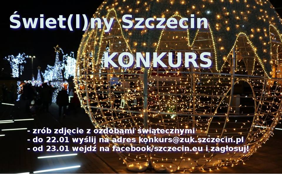 Zarząd Dróg i Transportu Miejskiego oraz Zakład Usług Komunalnych startują z noworocznym konkursem fotograficznym o nazwie Świet(l)ny Szczecin. Jaki należy spełnić warunek aby wziąć w nim udział? Trzeba zrobić zdjęcie wybranych przez siebie iluminacji świątecznych znajdujących się w Szczecinie i do 22 stycznia wysłać na adres konkurs@zuk.szczecin.pl. W mailu powinny znaleźć się również imię i nazwisko autora oraz numer kontaktowy.