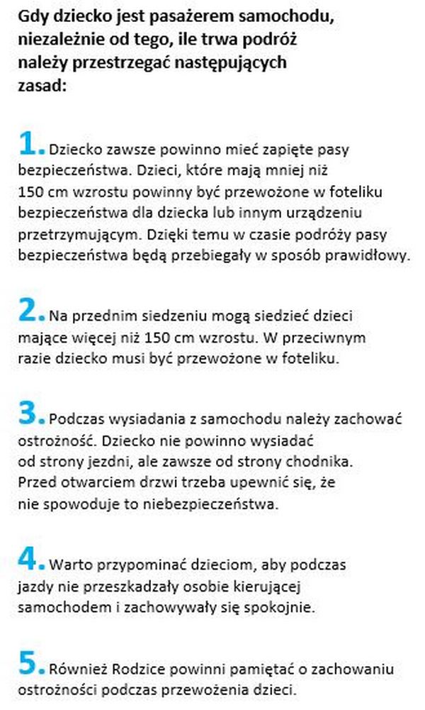 Należy też wcześniej porozmawiać z małym pasażerem, jak właściwie zachować się w czasie podróży. Dziecko powinno wiedzieć, że trzeba być spokojnym i nie wolno rozpraszać uwagi prowadzącego kierowcy, ponieważ chwila nieuwagi wystarczy, by spowodować wypadek.