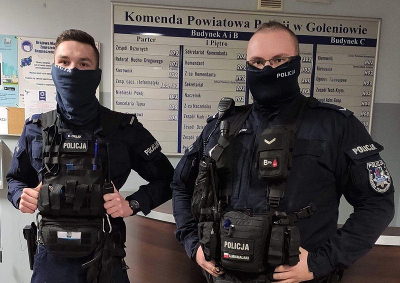 Sierż. Artur Michalski i st.post. Eryk Cielek z goleniowskiej komendy uratowali 67-latka z płonącego mieszkania. Funkcjonariusze nie czekając na przyjazd strażaków, z narażeniem życia wyważyli zamknięte drzwi mieszkania, po czym wyprowadzili z niego mężczyznę. Dzięki szybkiej interwencji policjantów nie doszło do tragedii.