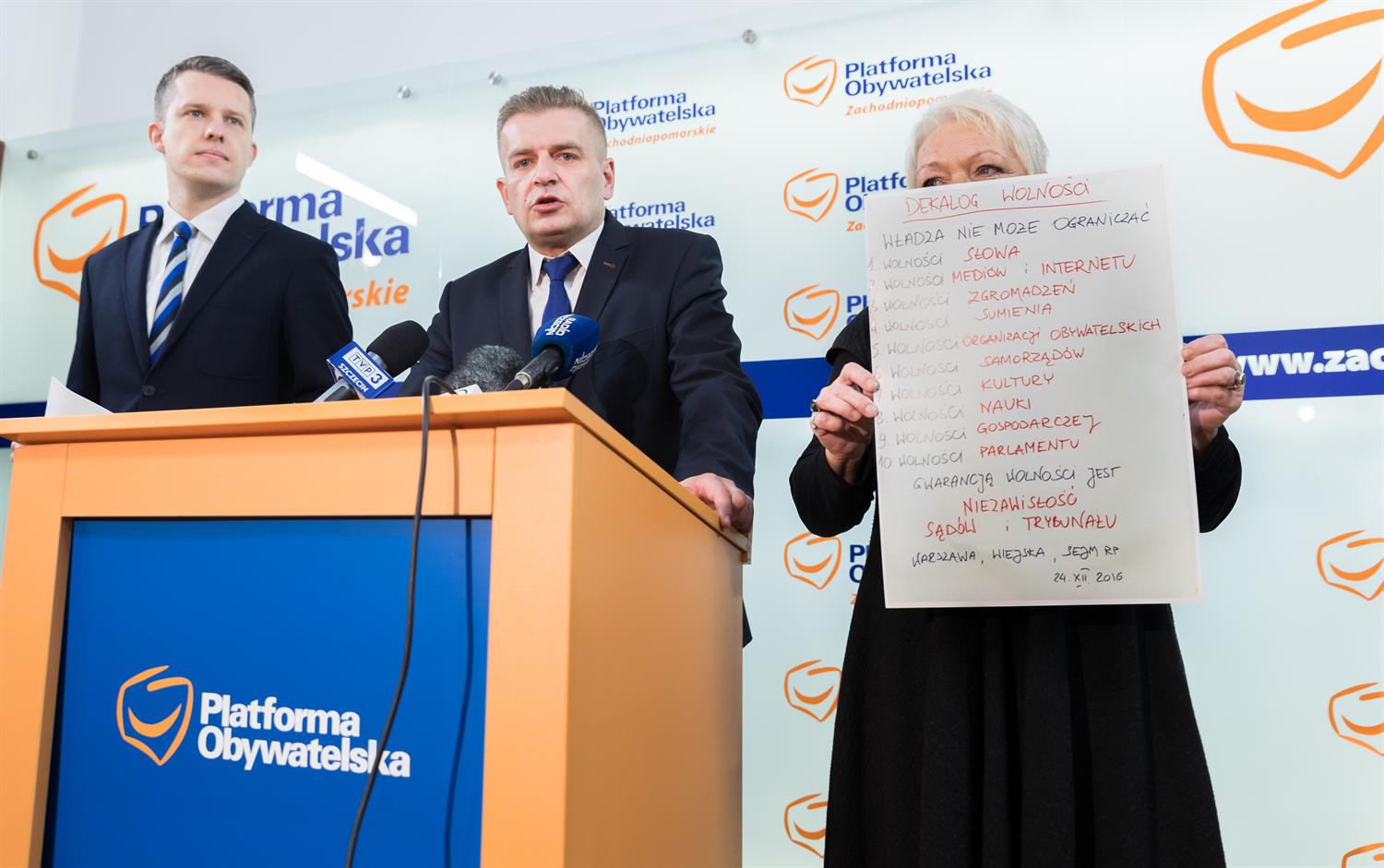 Na zdjęciu: Posłowie PO na konferencji prasowej w Szczecinie zaprezentowali dekalog wolności, którego zapowiadają strzec