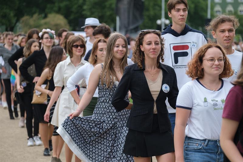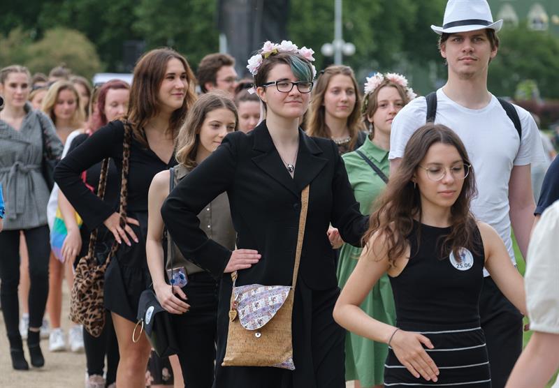 W kontuszach, eleganckich sukienkach, garniturach. ale i w dżinsach, nawet z plecakami i telefonami w rękach - barwny korowód szczecinian zainspirowanych przez tegorocznych maturzystów, którym pandemia odebrała studniówki, zatańczył w piątkowe popołudnie w alejach Jasnych Błoni.