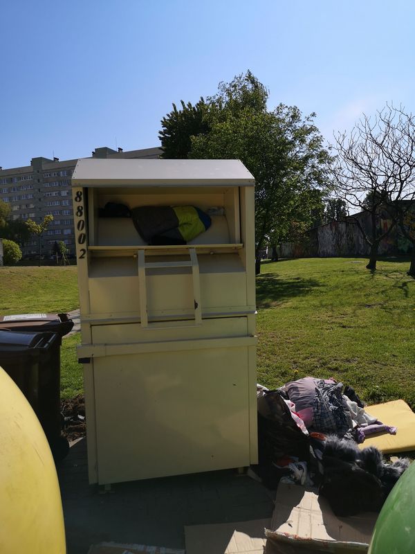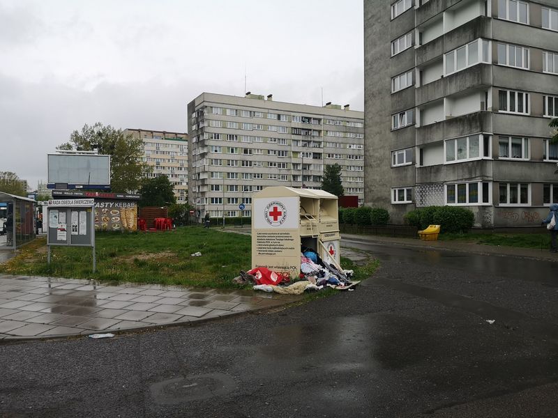 Drugi pojemnik widoczny na zdjęciu (przy ul. 26 Kwietnia) nie wiadomo do kogo należy, ale można przypuszczać, że do jakiejś firmy, która zbiera w ten sposób ubrania do sklepów z używaną odzieżą, na czym wiele firm żeruje. Widać to doskonale jak opróżniane są pojemniki, gdzie na oczach przechodniów dokonywana jest segregacja odzieży. Lepsza idzie do sklepów, a gorsza na inne cele, często jako czyścidło.