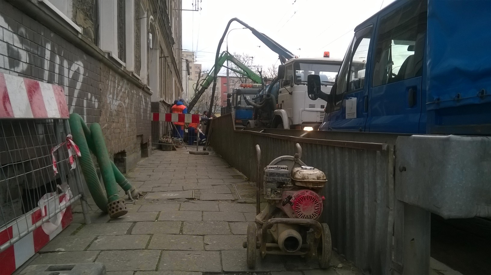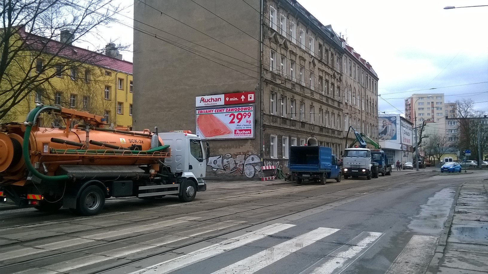 Awaria sieci wodociągowej przy ul. Chmielewskiego pozbawiła wody mieszkańców kilku budynków w tej okolicy. Ekipy Zakładu Wodociągów i Kanalizacji usuwają awarię, ale ciężki sprzęt zablokował torowisko tramwajowe.