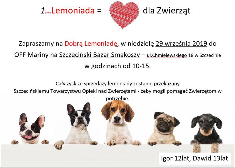 Dwóch przyjaciół - Igor (12 lat) oraz Dawid (13 l.) - postanowiło pomóc podopiecznym Towarzystwa Opieki nad Zwierzętami. Wymyślili akcję charytatywną ph. „Dobra Lemoniada". Będą ją serwować odwiedzającym Szczeciński Bazar Smakoszy. Już w tę niedzielę (29 bm.), w godz. 10-15.