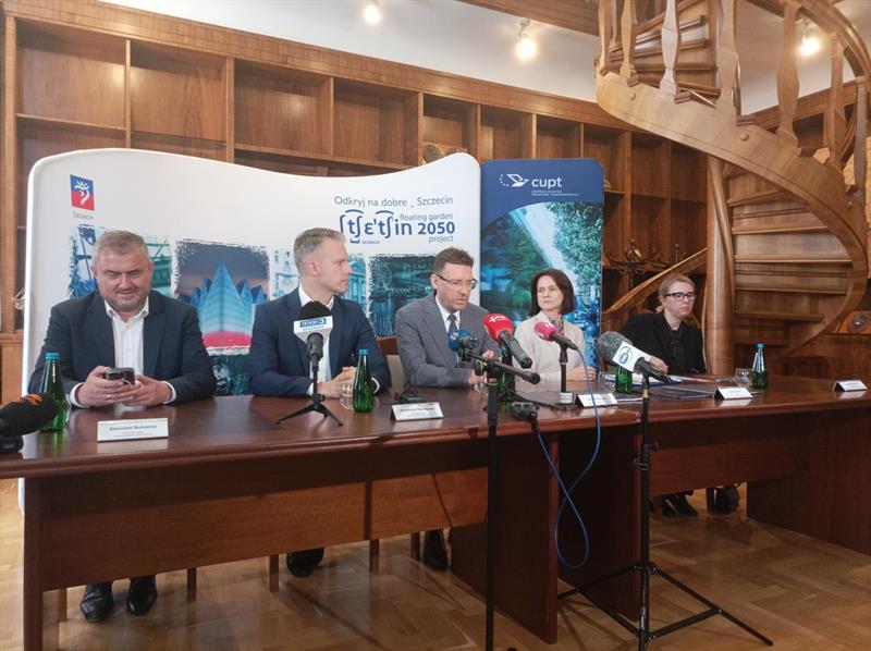 O unijnych pieniądzach mówili w poniedziałek w szczecińskim magistracie (od lewej) sekretarze stanu w Ministerstwie Infrastruktury Stanisław Bukowiec i Arkadiusz Marchewka, zastępca prezydenta Szczecina Michał Przepiera, dyrektor Centrum Unijnych Projektów Transportowych Joanna Lech i podsekretarz stanu w Ministerstwie Funduszy i Polityki Regionalnej Monika Sikora. Fot. Alan Sasinowski