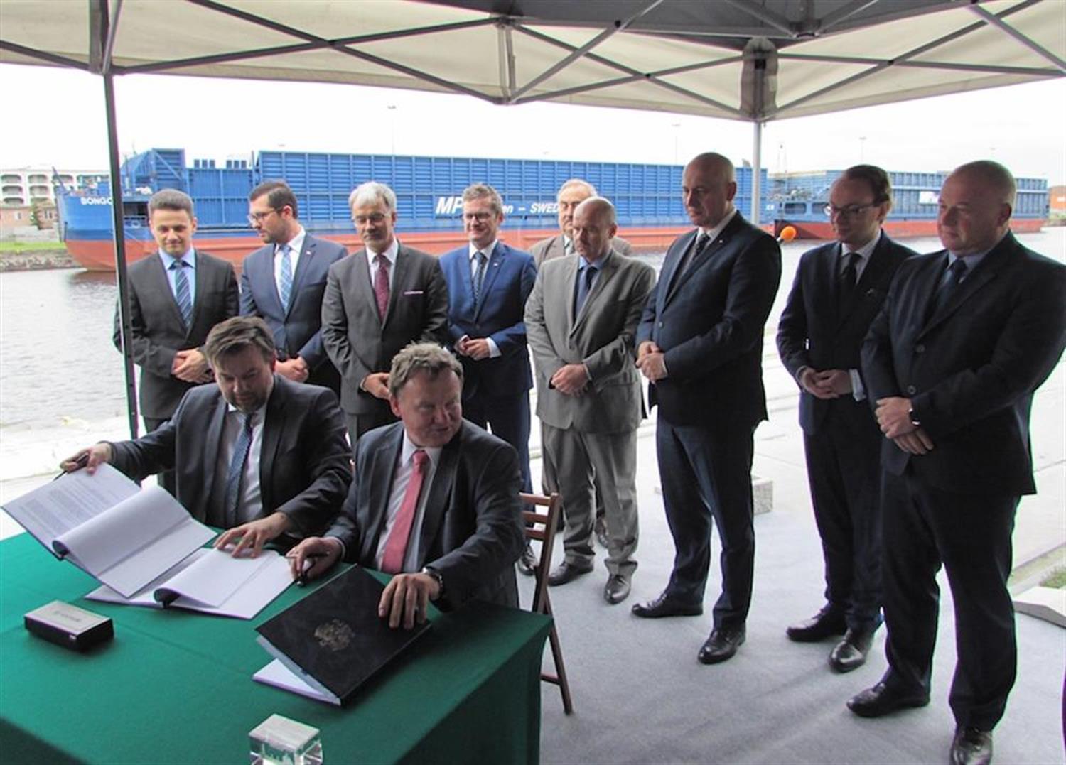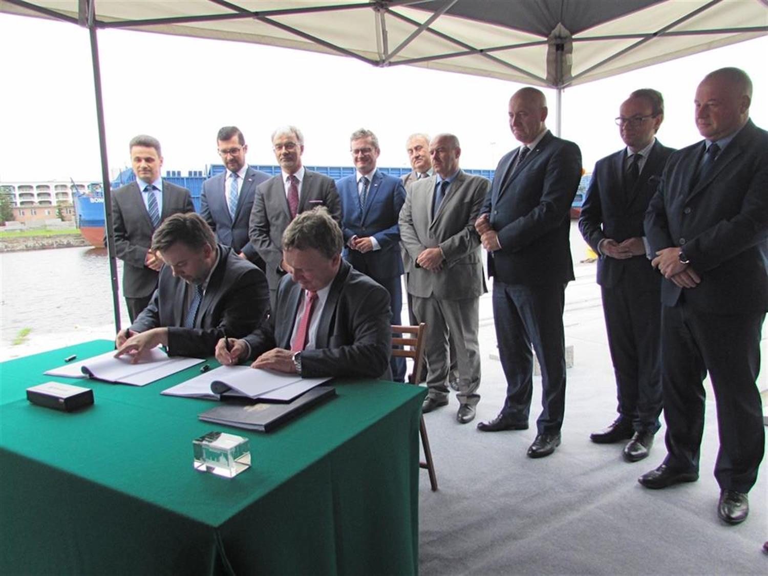 Umowę w tej sprawie podpisali Przemysław Gorgol, dyrektor Centrum Unijnych Projektów Transportowych oraz Ireneusz Merchel, prezes PKP Polskich Linii Kolejowych. W wydarzeniu uczestniczyli m.in.: wicemarszałek Sejmu Joachim Brudziński, wiceminister rozwoju Jerzy Kwieciński, wiceminister gospodarki morskiej i żeglugi śródlądowej Grzegorz Witkowski, poseł Artur Szałabawka, wojewoda Krzysztof Kozłowski, zarząd ZMPSiŚ z prezesem Dariuszem Słaboszewskim na czele.