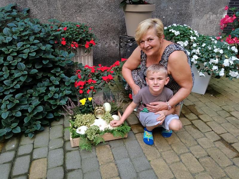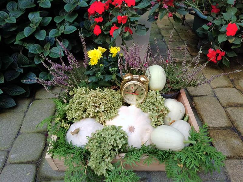 – Głównie popracowałam nad wystrojem – mówi Alina Madejewska. – Byłam ostatnio z wnuczkiem na spacerze i przynieśliśmy jesienne kasztany. Posłużyły nam one za element dekoracyjny. Do kasztanów dodałam wrzosy i dynię, a całość umieściłam w drewnianej skrzynce. Jest tam również złoty budzik, który symbolicznie odmierza mijający czas i nadchodzącą jesień.