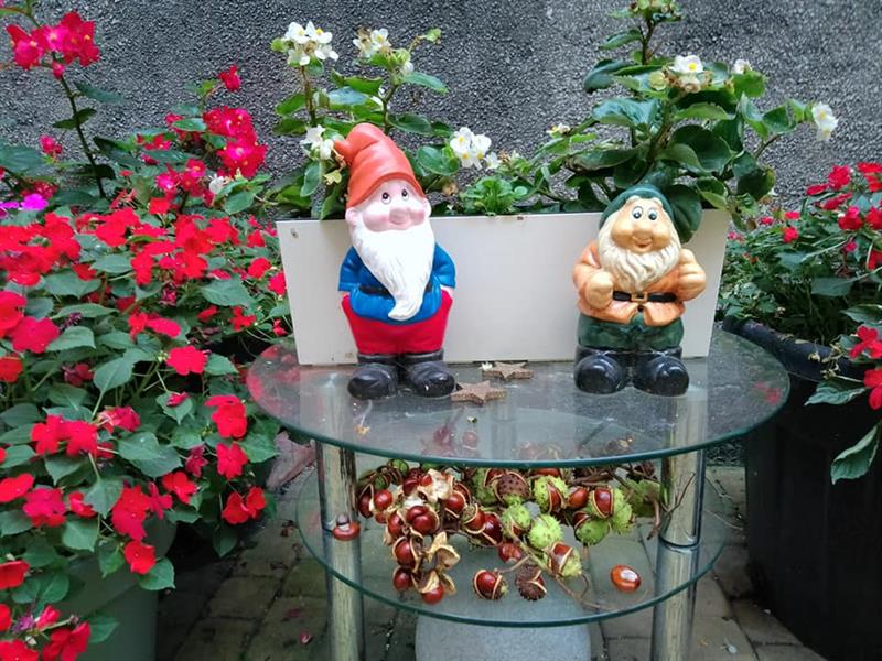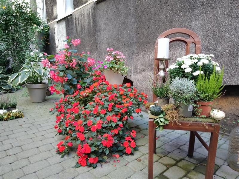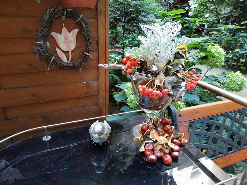 Ostatnio p. Alina Madejewska, mieszkanka oficyny i zarazem inicjatorka przekształcenia podwórka w ogród, poinformowała nas o zmianach, jakie tam zaszły. Przeszło kolejne przeobrażenie. Nadal jest pełne zieleni, ale do wystroju doszły elementy uwzględniające jesienną porę roku.