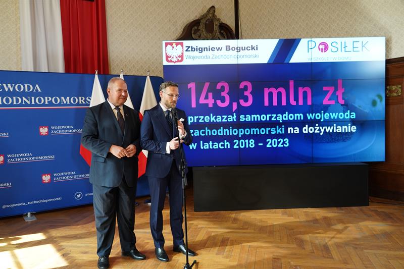 Wojewoda Zbigniew Bogucki przekazał przedstawicielom zachodniopomorskich gmin umowy na dofinansowanie programu "Posiłek w szkole i w domu". Łącznie kwota przeznaczona na ten projekt przyznana samorządom wzrosła w tym roku o blisko 5,5 mln zł - z 21,3 mln zł do prawie 26,8 mln zł.