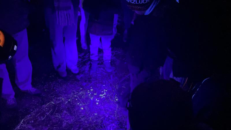 Na świnoujską plażę chętni wybrali się z kaszorkami (siatka z otworem rozpiętym na obręczy, mniej więcej taka jak do połowu ryb) i latarkami. Niektórzy nie wiedzieli, że „zwykła” latarka nie tylko nie wystarczy, lecz wręcz może utrudnić poszukiwanie. Potrzebna jest bowiem latarka emitująca światło ultrafioletowe. Zebrani mogli zobaczyć różnicę. Podświetlony zwykłą latarką bursztyn był niemal niewidoczny. Dzięki natomiast swoim właściwościom fluorescencyjnym, w promieniach UV świecił na żółto. Wyraźnie tylko wtedy, gdy zwykłe latarki były wyłączone. Podobno bursztyny podświetlone latarką UV świecą też na niebiesko.