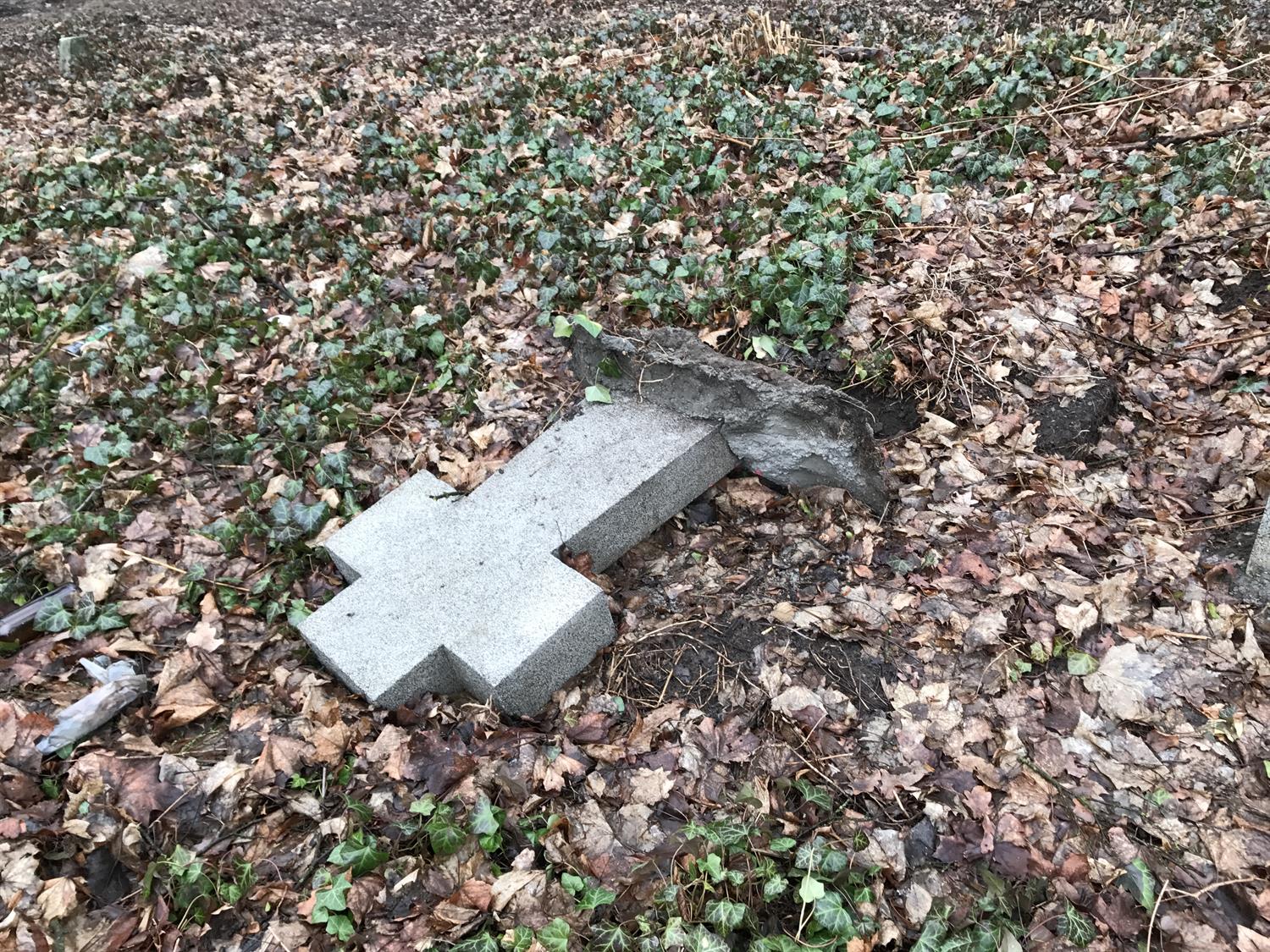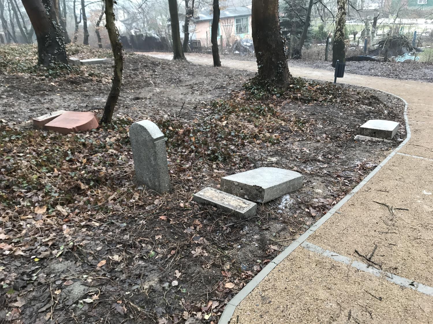 Od zakończenia prac minęło zaledwie kilka tygodni, a już wiele płyt zostało powalonych na ziemię. Zapewne to sprawka wandali, którzy również i wcześniej dewastowali to miejsce. Na wandali nie ma rady, no może poza monitoringiem, który pozwala czasami na ujęcie sprawców. Przy okazji, patrząc na powalone nagrobki, trzeba się zastanowić nad sposobem ich montażu. Jedne zostały przytwierdzone do cokołu przy pomocy metalowej kotwy (bardzo krótkiej) i kleju (chyba niezbyt mocnego); inne osadzone są w nieestetycznej wylewce betonowej.