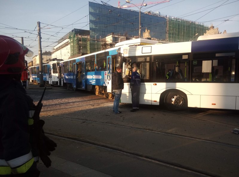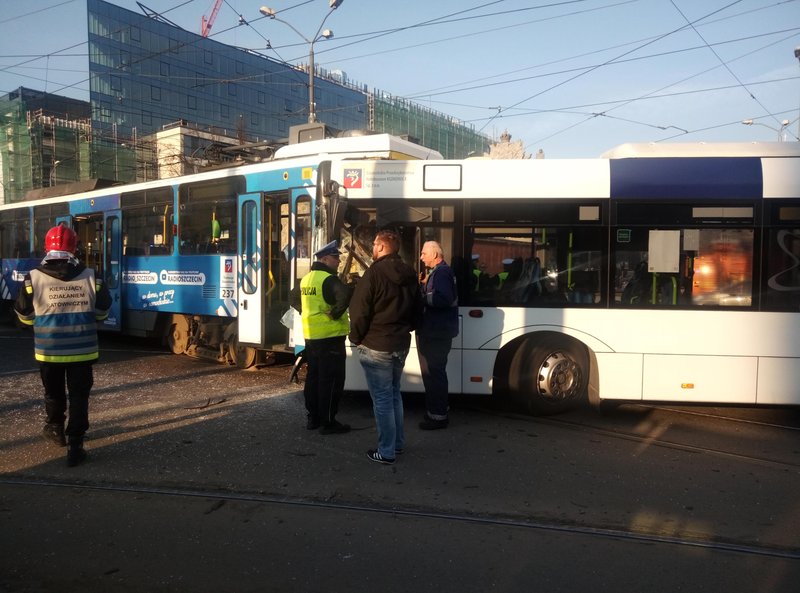 Poważny wypadek w centrum. Zderzenie tramwaju z autobusem