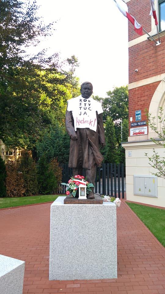 Policja poszukuje osoby, która powiesiła na pomniku Lecha Kaczyńskiego (stojącym przy al. Wojska Polskiego w Szczecinie) koszulkę z napisem "Konstytucja, Jędrek!". Policja wskazuje paragraf i szuka sprawcy.