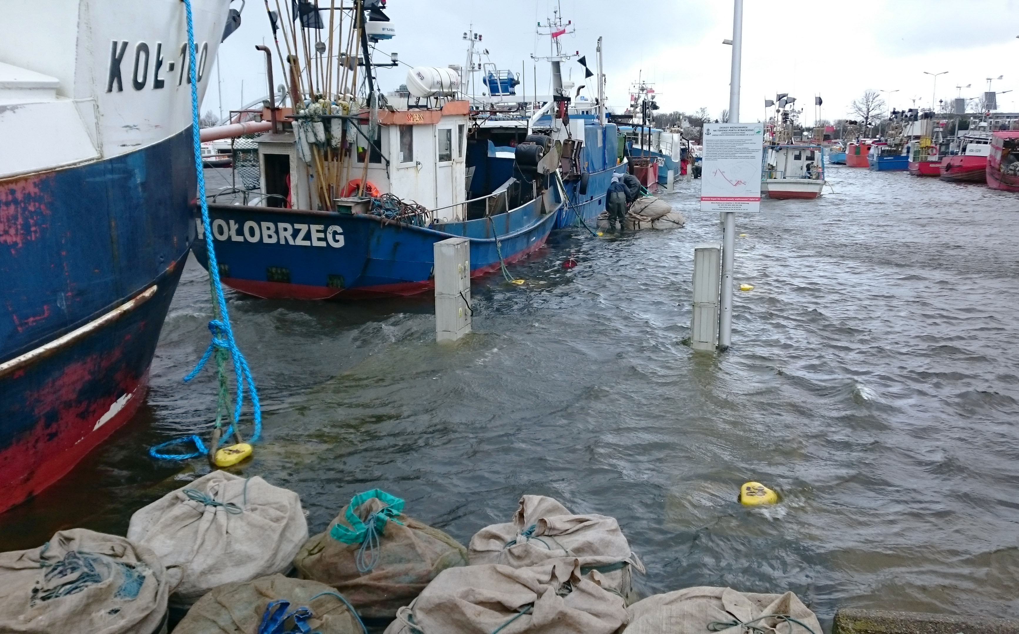Zalane zostały pomosty, przy których stacjonują kutry rybackie. Ich załogi walczą o to, aby jednostki nie „wyskoczyły na brzeg”. Woda dostała się także na miejskie bulwary biegnące wzdłuż Parsęty. Podtopiony został również teren Skansenu Morskiego. Tak wysokiego stanu wody w porcie nie odnotowano od kilku lat.©℗