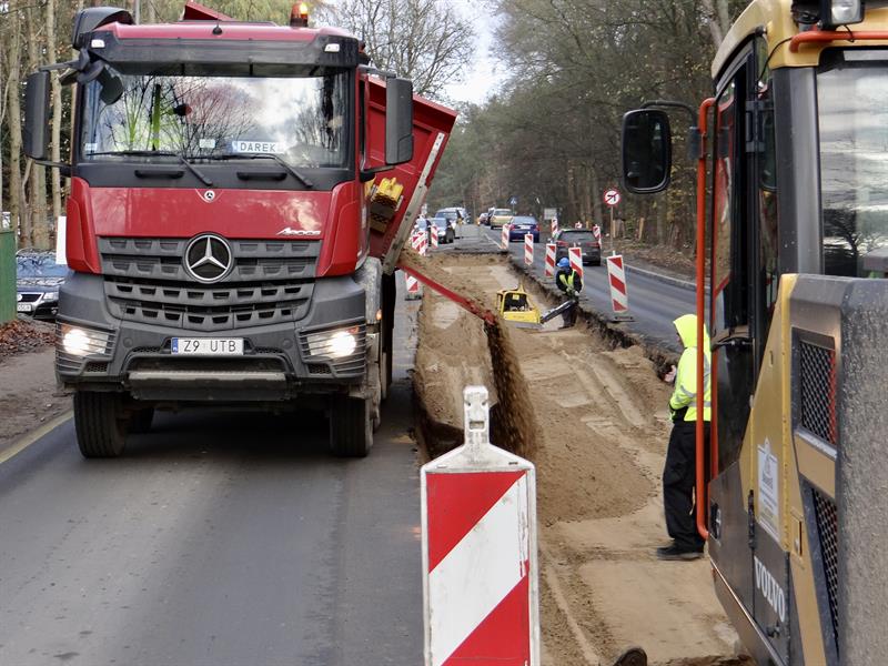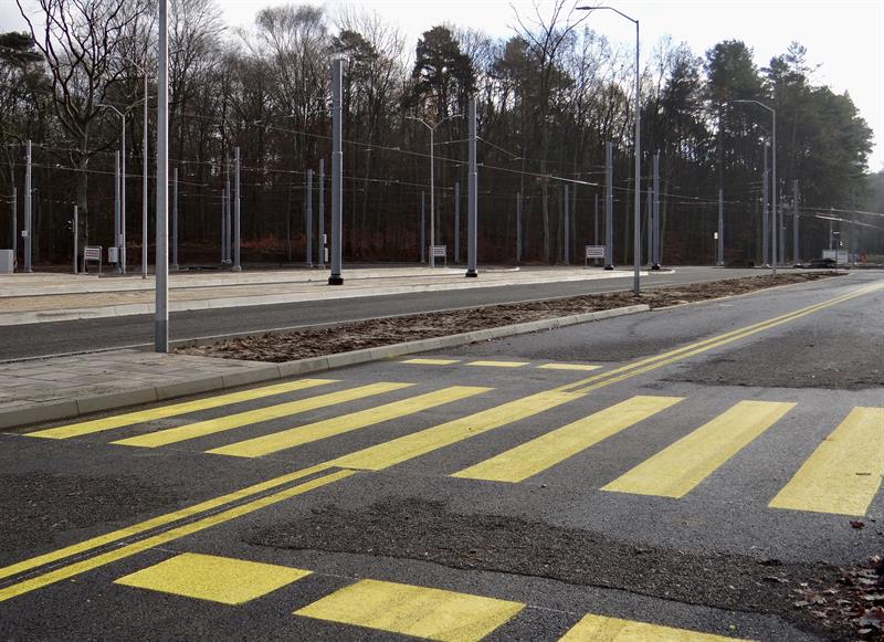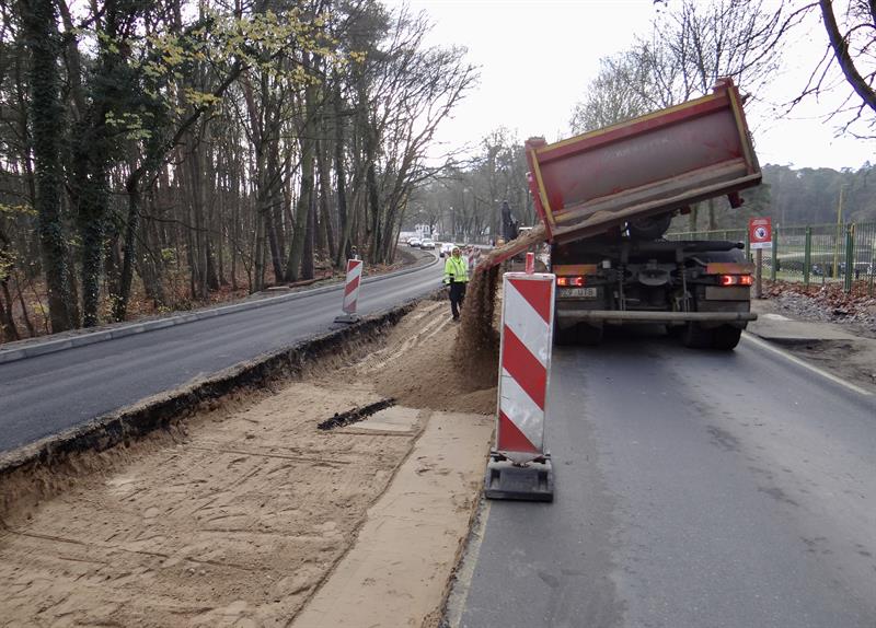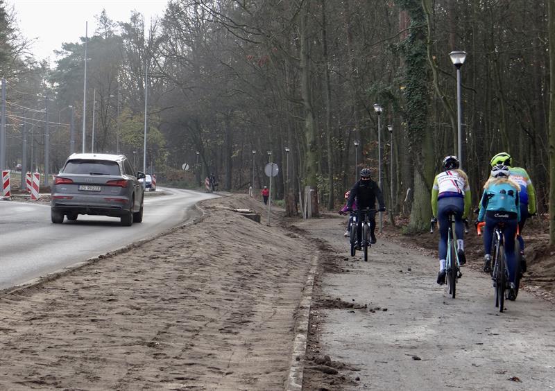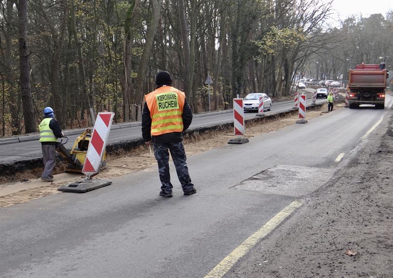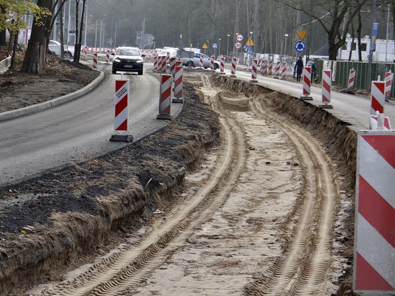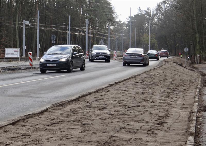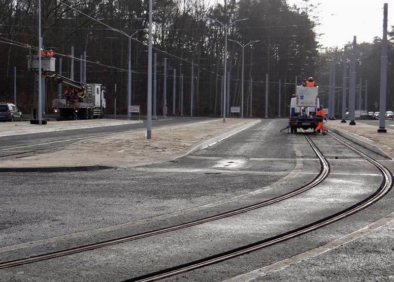 W miniony weekend trwały ostatnie prace przy regulacji sieci trakcyjnej, zlecone zatrudnionej jako wykonawca spółce PKP Energetyka. Aktualnie trwają też prace drogowe przy rozbudowie (poszerzaniu) pasa jezdni na odcinku ul. Emila Zegadłowicza do wysokości skrzyżowania z Ul. Kąpieliskową. Tam ruch od pętli w kierunku Głębokiego i dalej Pilchowa odbywa się nowym pasem jezdni. Drogowcy prowadzą tam teraz roboty przy usypywaniu i utwardzaniu warstw ziemnych pod podbudowę w części środkowej pasa jezdni. Z uwagi na dojeżdżający ciężki sprzęt, w tym wywrotki i koparki, ruch jest sterowany ręcznie od strony pasa jezdni w kierunku centrum urządzonego tymczasowo w bezpośrednim sąsiedztwie ogrodzenia kąpieliska. Ponadto na wysokości pętli gotowy jest w części pas nowej jezdni i poszerzonego dojazdu drogowego od al. Wojska Polskiego przed mającym tam powstać rondem. Wykonany został na nowo pas drogi rowerowej, usypane, utwardzone i obsiane też zostały trawą od nowa skarpy wzdłuż jezdni.