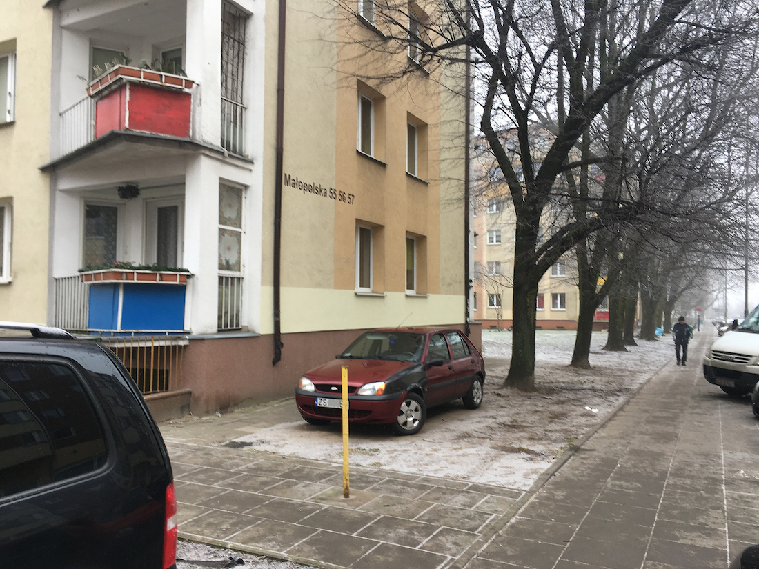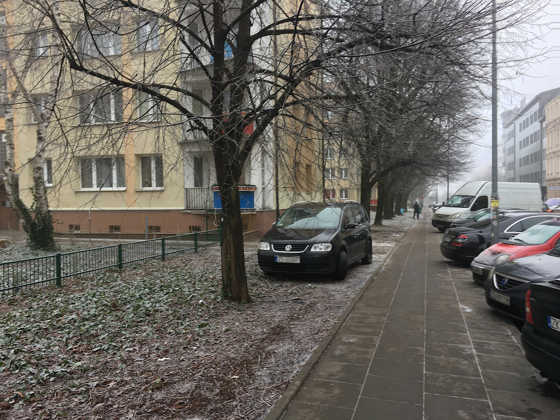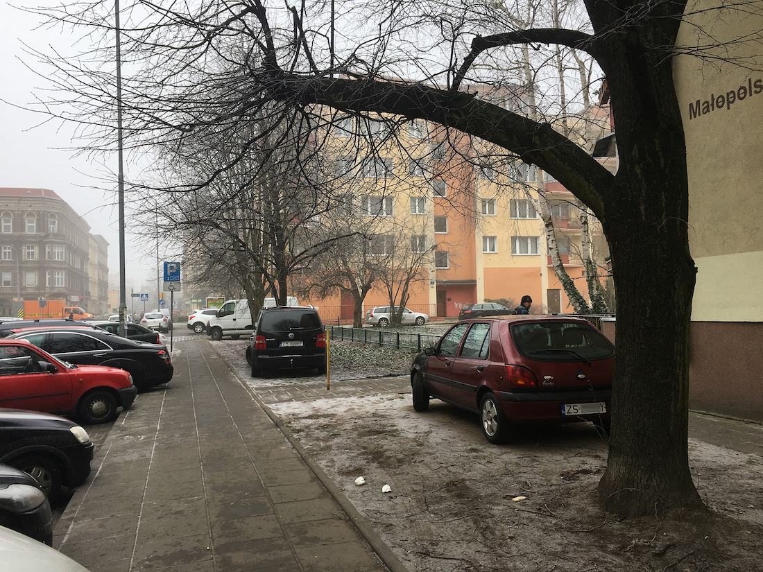 Ulica Małopolska, centrum miasta. Kierowca osobowego forda parkuje na trawniku już od kilku dni. To nie jest miejsce postojowe, więc omijają go opłaty SPP. Pomysł szybko podchwycili inni, jak chociażby kierowca czarnego volkswagena i białego samochodu dostawczego.