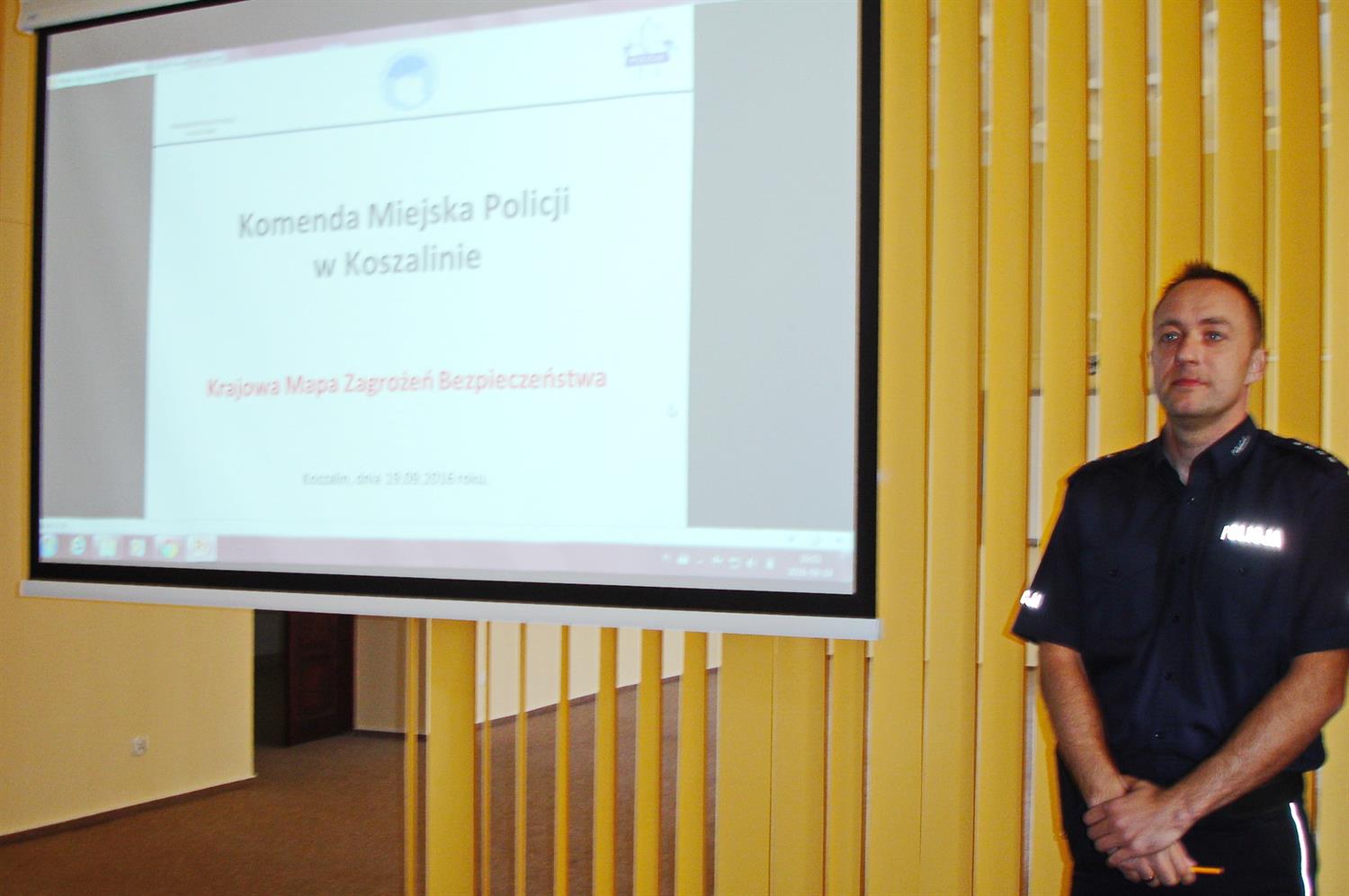 Na zdjęciu: kom. Krzysztof Rosiak przedstawił Krajową Mapę Zagrożeń Bezpieczeństwa na podstawie programu pilotażowego w Pomorskiem.