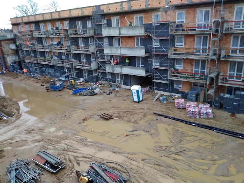 – Obecnie we wszystkich budynkach zakończono już stan surowy, trwa montaż okien, instalacji, kładzione są tynki i cementowe podłoża pod posadzki. W trakcie jest szpachlowanie ścian i roboty elewacyjne – dodaje Tomasz Klek. – Inwestycja położona jest na terenie objętym ochroną konserwatorską w zakresie historycznej struktury przestrzennej. Z tego względu dwa istniejące narożne budynki ceglane poddane są kompleksowej renowacji i adaptacji na trzy lokale użytkowe. Aktualnie zakończono w nich pokrycie dachu i izolacje fundamentów. W trakcie wykonywane są instalacje elektryczne i sanitarne oraz podłoża pod posadzki.