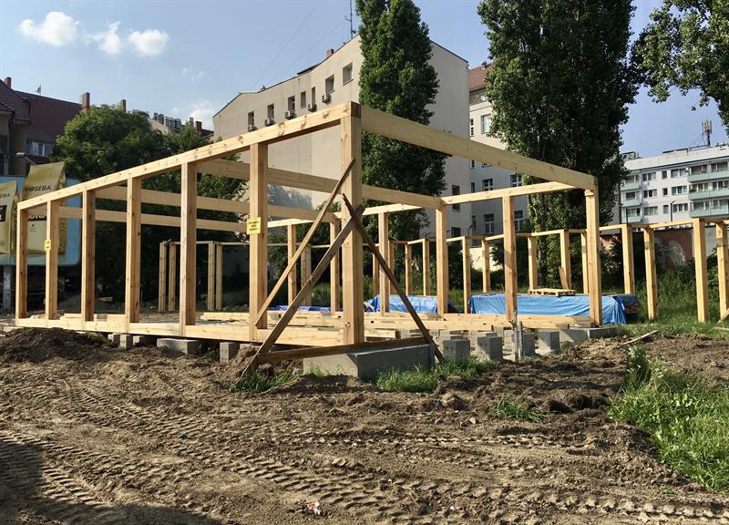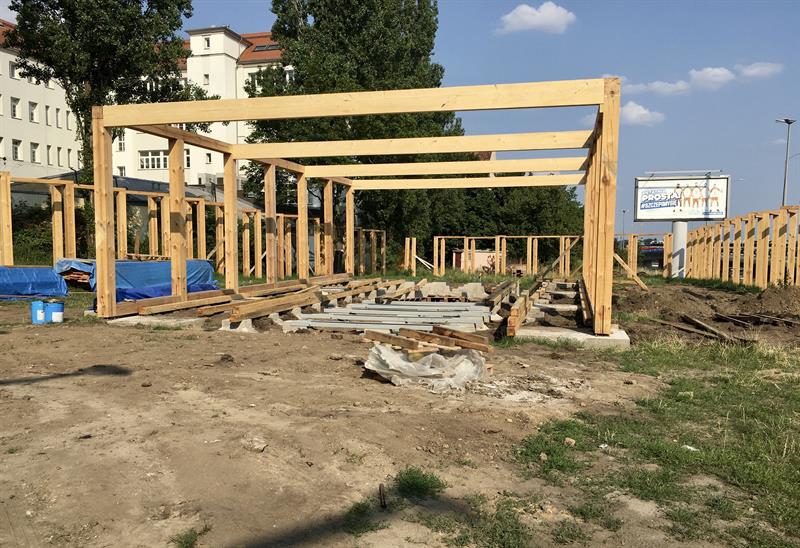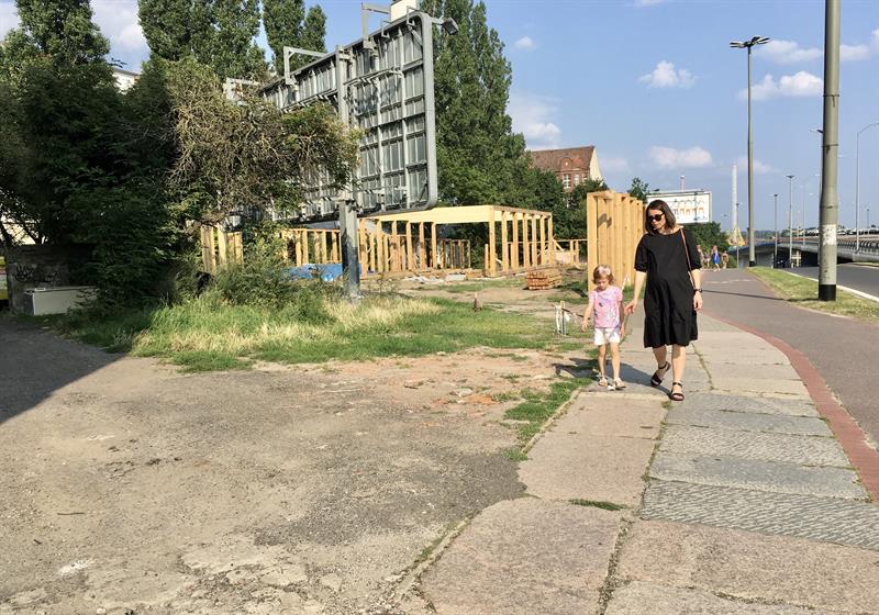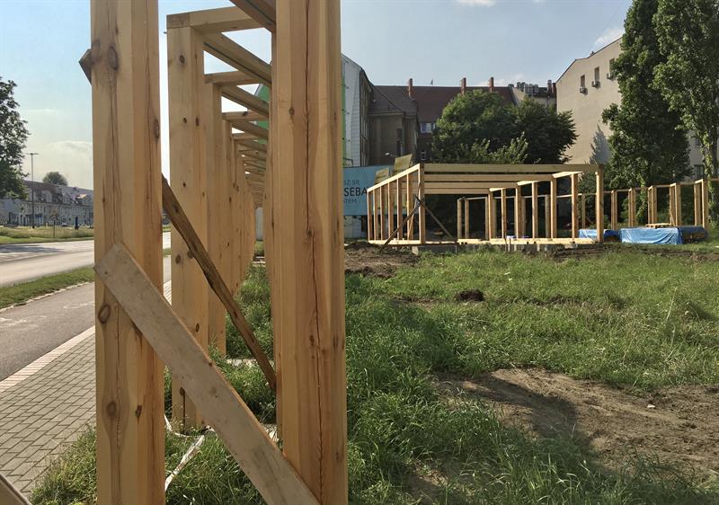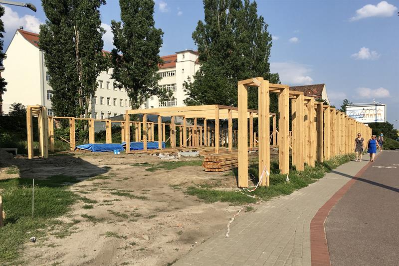 Ażurowa konstrukcja drewnianej pergoli już stoi. Otacza teren przyszłego patio, na którym wydać podbudowę przyszłej plenerowej sceny. Wkrótce zostanie połączona drewnianym pomostem - symbolicznie - z miastem oraz przyszłym ogrodowym barem. Dopiero na finał prac - jeszcze tego lata - na ów teren w sąsiedztwie ul. Duczyńskiego powróci zieleń.