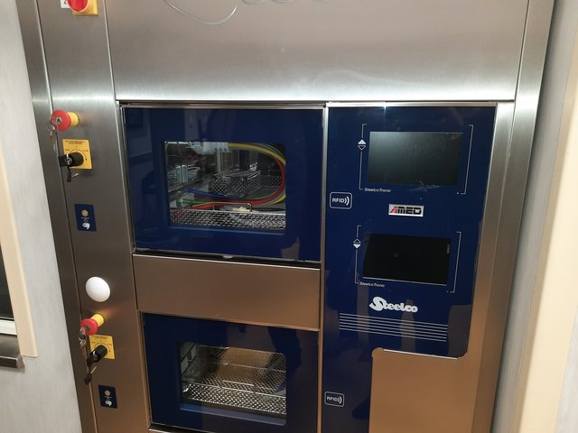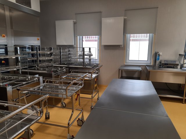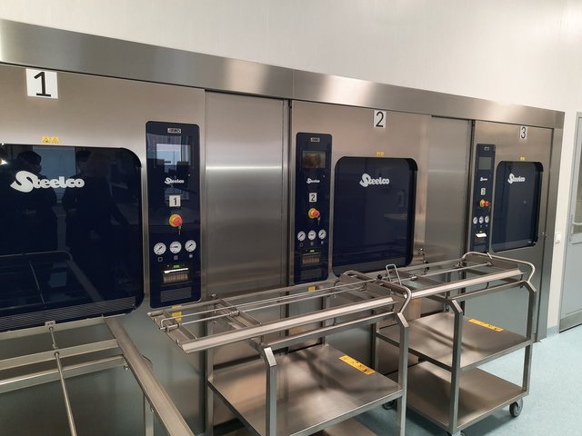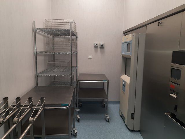 Pomiędzy strefą czystą i sterylną są zainstalowane przelotowe sterylizatory parowe z własnymi elektrycznymi wytwornicami pary. W wydzielonych pomieszczeniach umieszczono sterylizatory na tlenek etylenu i sterylizator na nadtlenek wodoru z plazmą – służą do sterylizacji wyrobów nieodpornych na wysoką temperaturę. Pomieszczenia, w których jest zainstalowany sterylizator na tlenek etylenu, są monitorowane detektorem gazu.