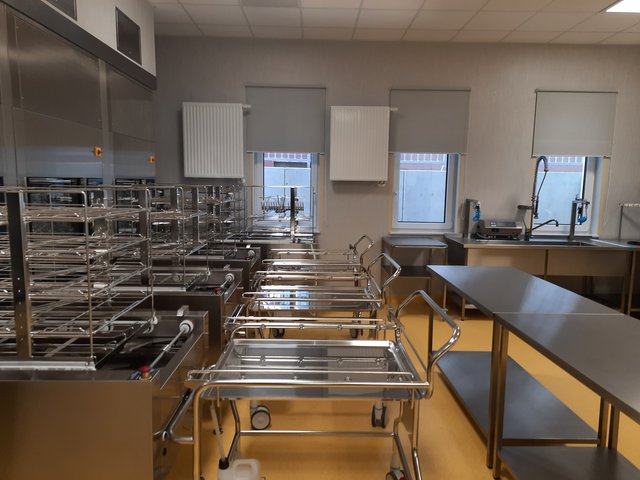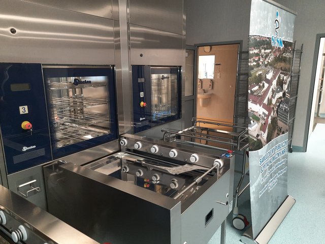 Każda ze stref ma nowoczesne wyposażenie. W tzw. strefie brudnej znajdują się m.in.: myjnia ultradźwiękowa, stoły robocze, stanowiska do ręcznej obróbki endoskopów giętkich – wspomagane przez automatyczne urządzenie do testu szczelności i mycia kanałów, przelotowe myjnie-dezynfektory z automatycznym załadunkiem i rozładunkiem wózków wsadowych. Wózki transportowe, pojemniki transportowe i sterylizacyjne są myte, dezynfekowane i suszone w dużej myjni-dezynfektorze. W „strefie czystej” znajduje się suszarka do narzędzi i wyposażenia aparatów anestezjologicznych oraz szafa do suszenia i przechowywania endoskopów giętkich w jałowym środowisku.