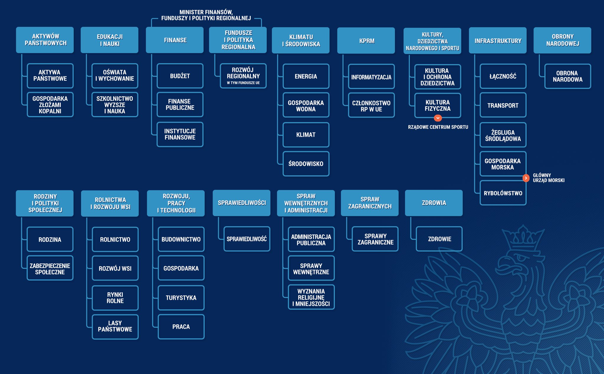 Szef Kancelarii Premiera Michał Dworczyk poinformował na portalu społecznościowym Twitter, jaki ma być nowy schemat działów administracji rządowej. Z zamieszczonej grafiki wynika, że ministrowi infrastruktury będą podlegały tak jak do tej pory sprawy łączności i transportu. W jego kompetencjach znajdą się także: żegluga śródlądowa, gospodarka morska i rybołówstwo, przy czym sprawami dwóch ostatnich ma się zajmować Główny Urząd Morski, nad którym nadzór również będzie sprawować minister infrastruktury.