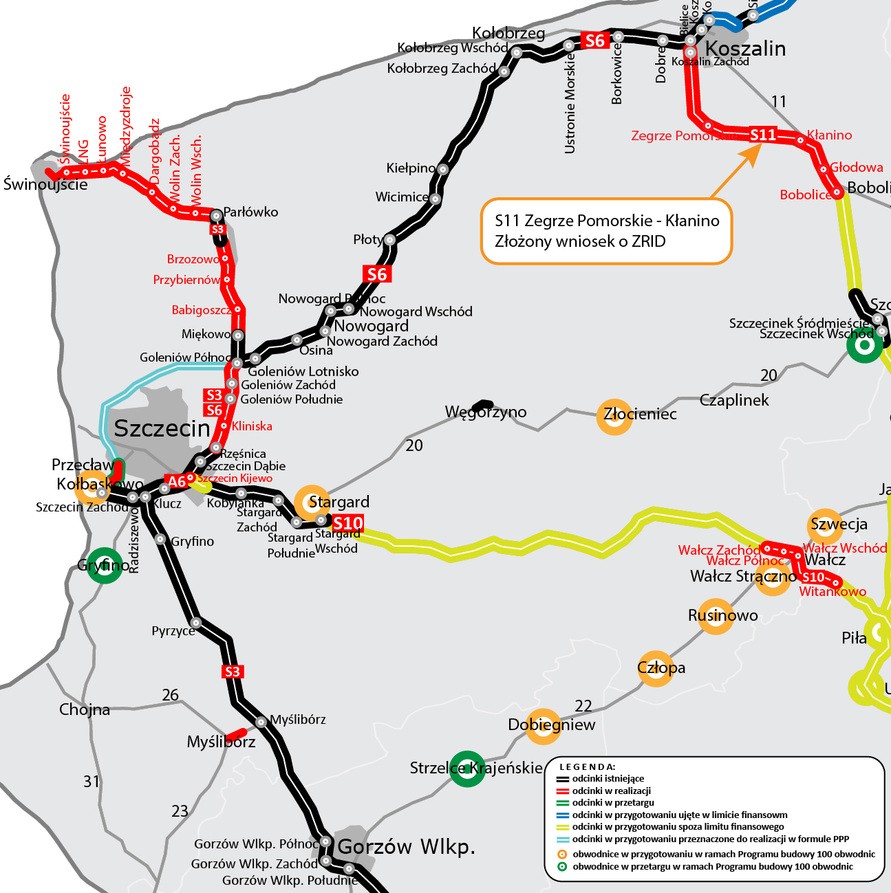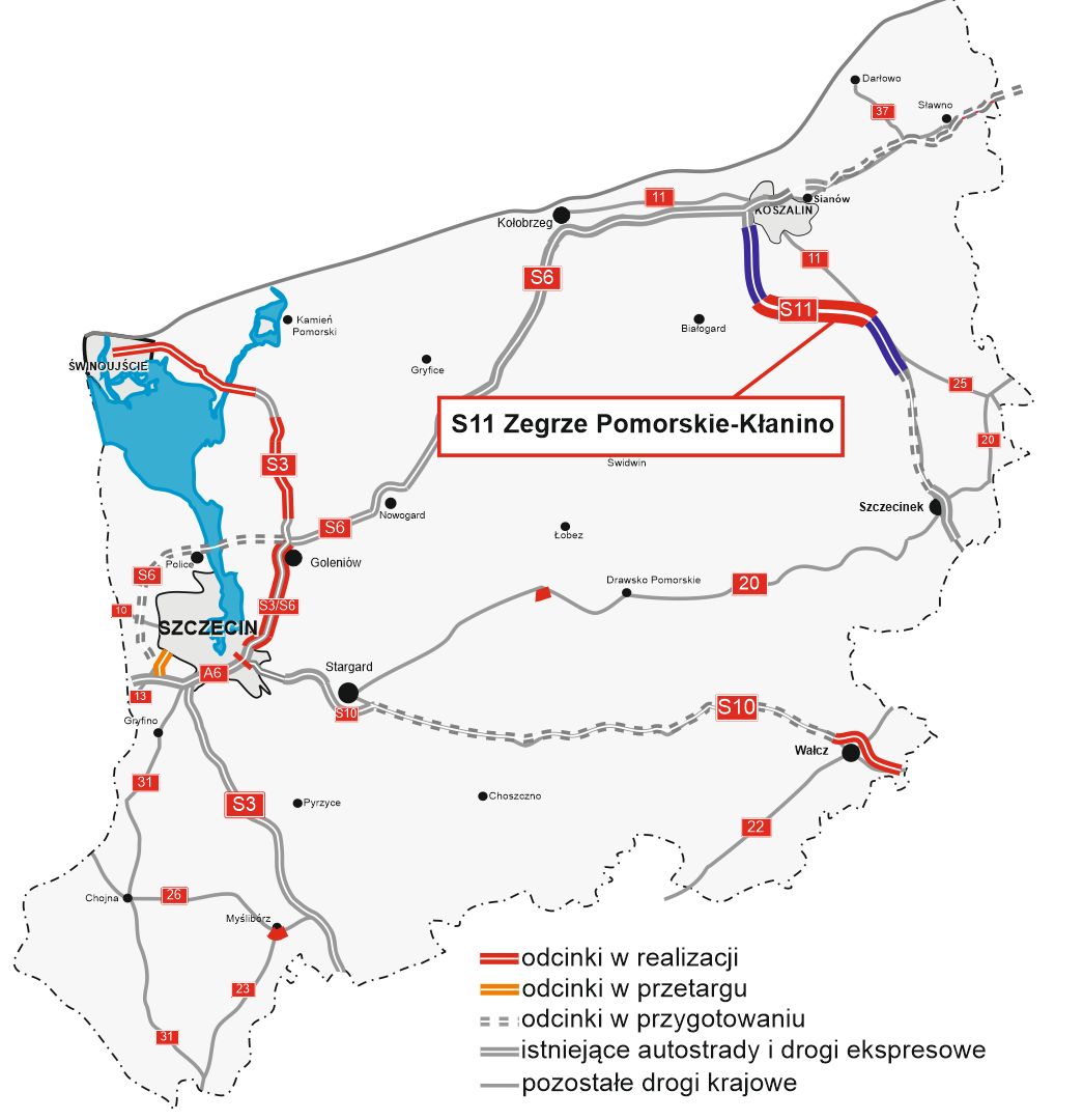 Do wojewody zachodniopomorskiego trafił wniosek o wydanie decyzji o zezwoleniu na realizację inwestycji drogowej (ZRID) dla odcinka drogi ekspresowej S11 od węzła Zegrze Pomorskie do węzła Kłanino o długości 19,3 km. Jej wydanie umożliwi rozpoczęcie robót budowlanych, co jest planowane w trzecim kwartale 2021 roku. Zakończenie realizacji inwestycji powinno nastąpić w 2023 roku.