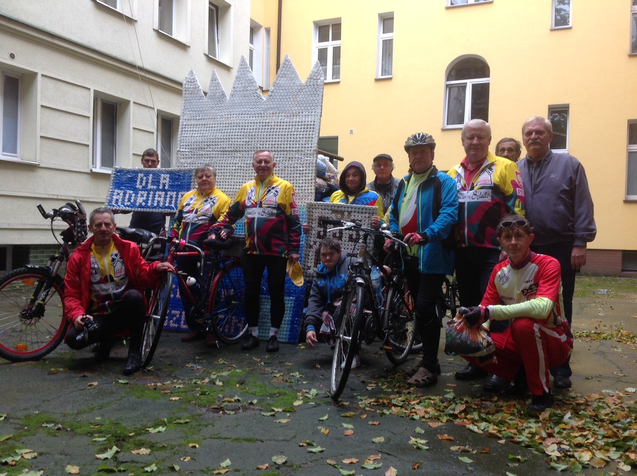 Od pięciu lat członkowie klubu rowerowego PTTK "Jantarowe szlaki" w Szczecinie zbierają plastikowe nakrętki i przekazują je na dobry cel. Od trzech lat wspierają w ten sposób Adriana Nowakowskiego, który potrzebuje pieniędzy na rehabilitację po wypadku drogowym. W sobotę spotkali się w podwórku przy ul. Przybysławy, by podsumować kolejną akcję. Część z 555 kilogramów zgromadzonych przez pół roku nakrętek ułożyli w kształt szczecińskiej filharmonii oraz napis "Dla Adriana".